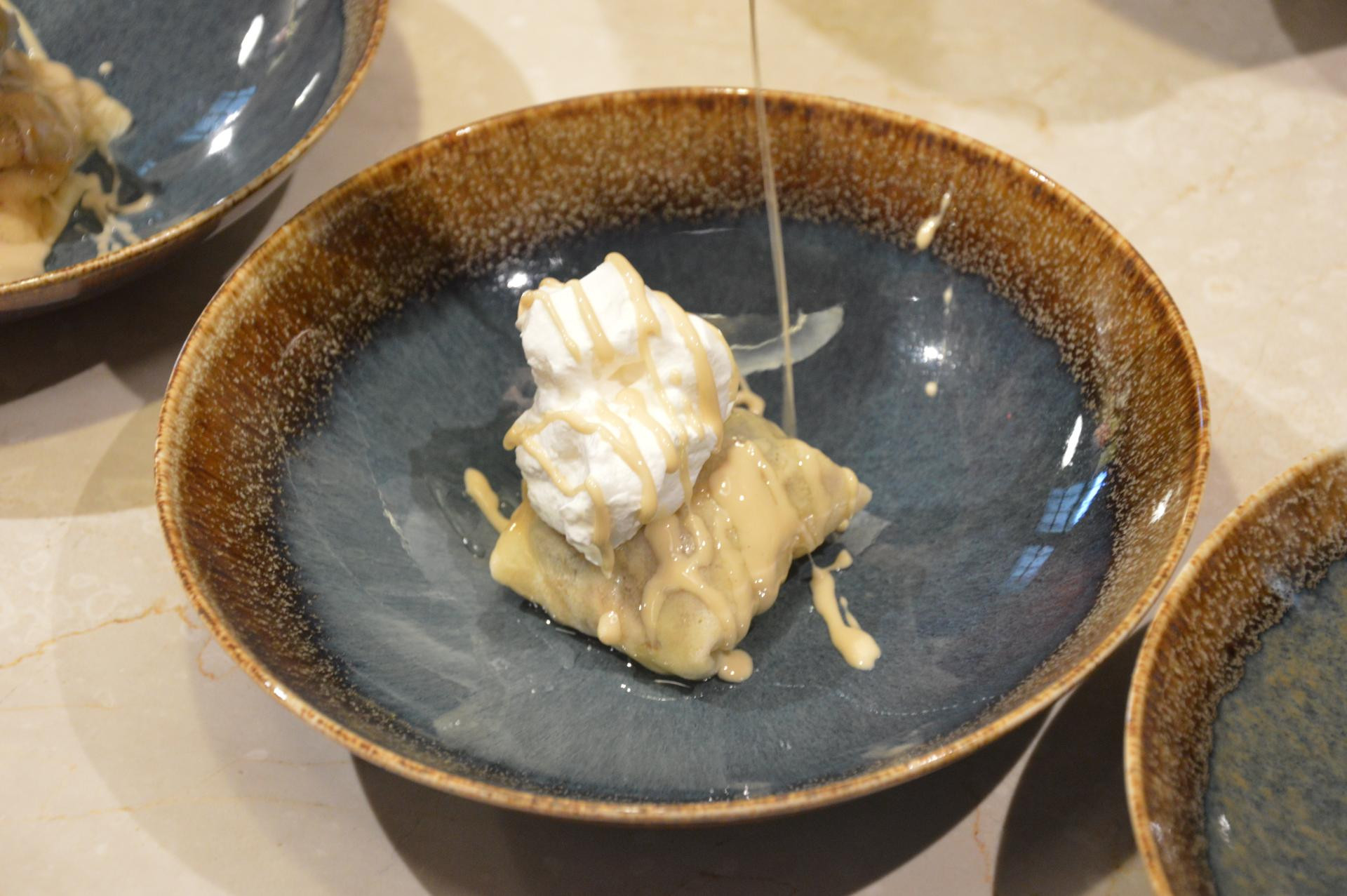 Palačinke punjene karameliziranom jabukom, trešnjama (u amarena stilu) i tostiranim lješnjacima te završeno sa šlagom i kremom od meda cvjeta bagrema i zlatošipke.
