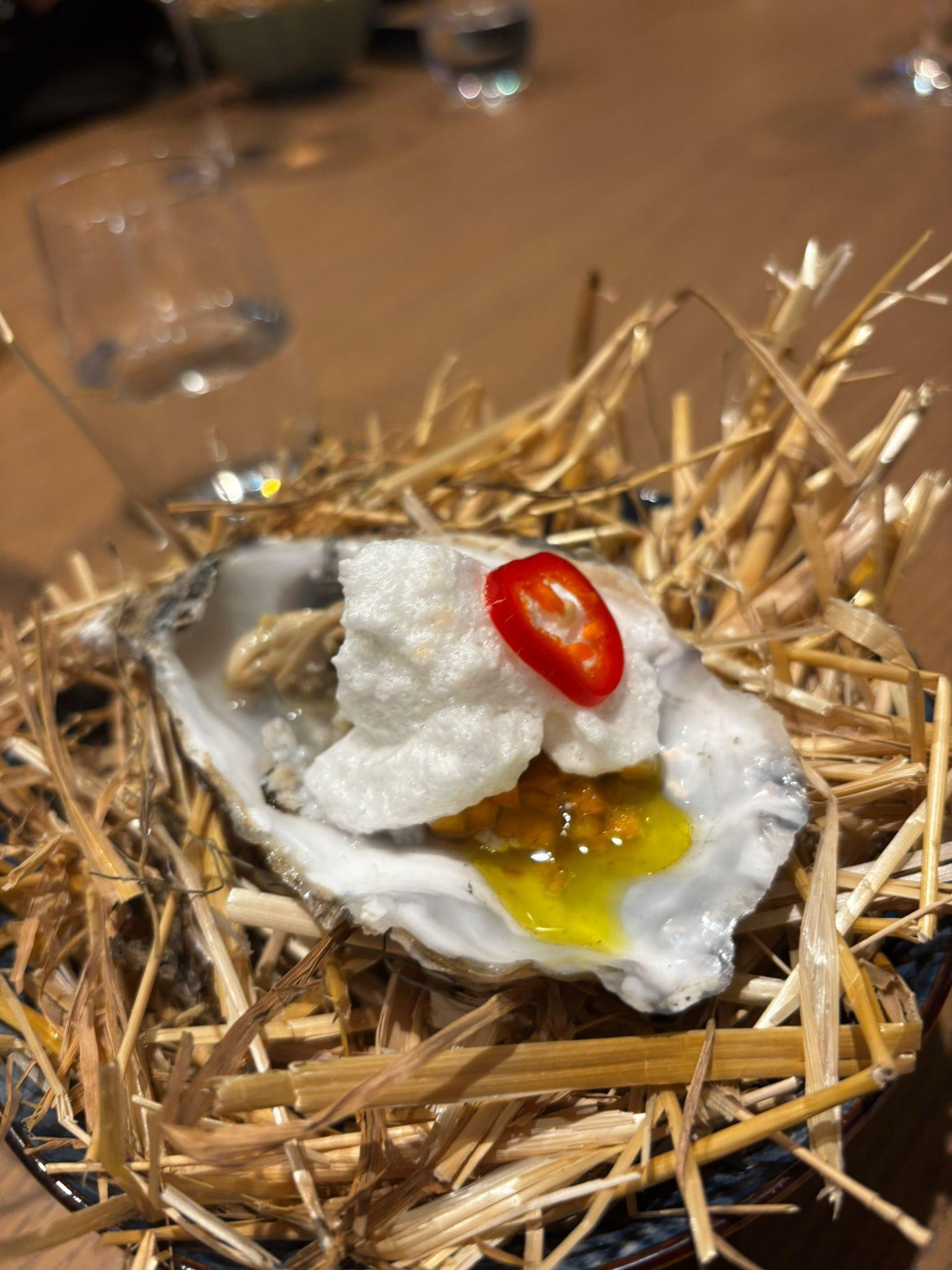 Grillana-dimljena kamenica s pestom od tikvica, ukiseljenim kakijem, tučenim bjelanjkom s grappom i svježom ljutom papričicom, sljubljena s mladim ekstra djevičanskim maslinovim uljem (Cossetto, berba 2025) mješavine sorata leccino, istarska bjelica, frantoio I buža te vinom Rose (Cossetto, berba 2024) mješavine sorata teran I hrvatica.