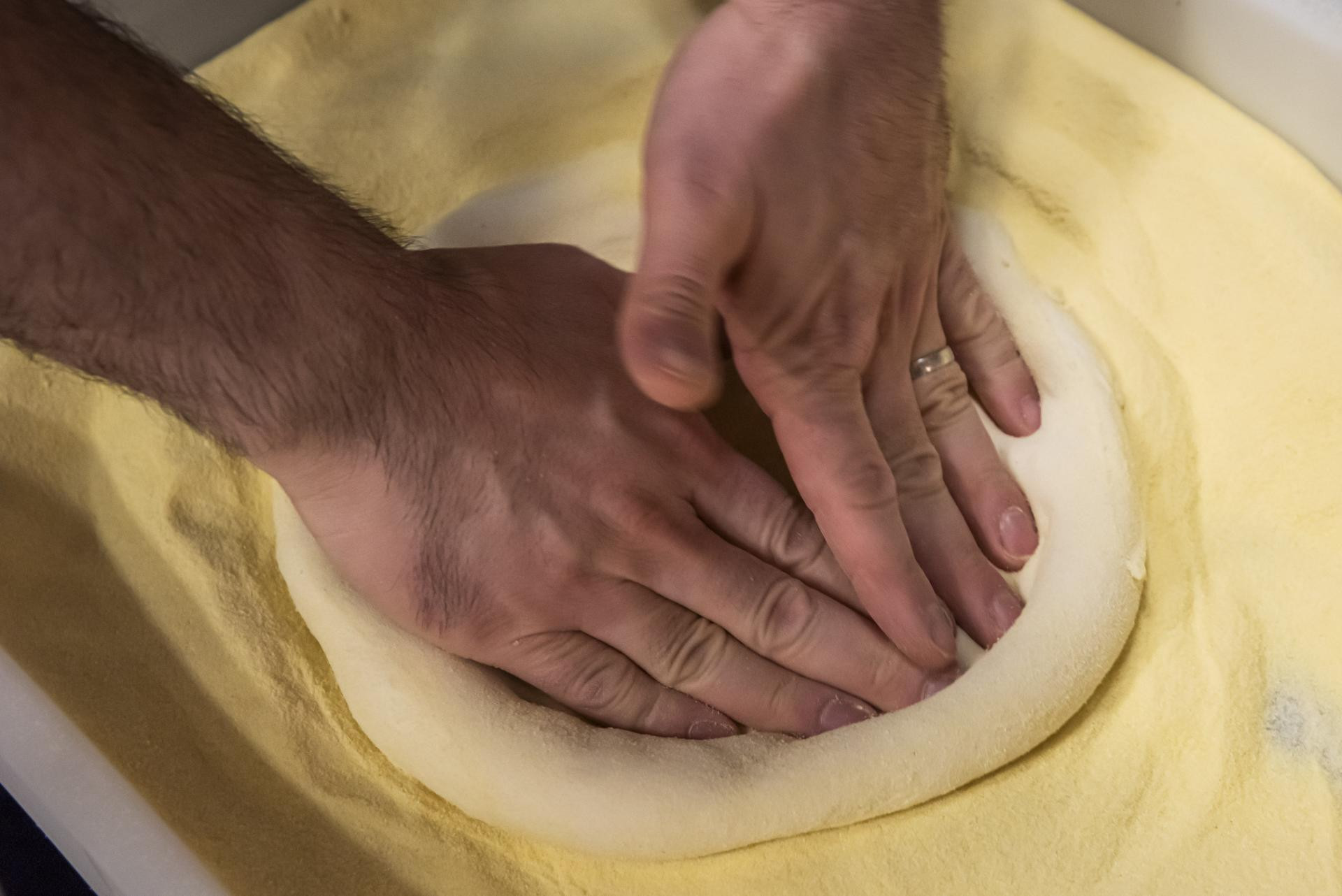 Nakon fermentacije, tijesto se dijeli na kugle od oko 250 g - što je idealno za pizzu promjera 28 - 30 cm i jednog gladnog čovjeka. Tijesto se razvlači prstima, nikako valjkom, jer valjak ubija mjehuriće, a to ne želimo. Želimo mjehuriće i rubove koji se napuhnu.
