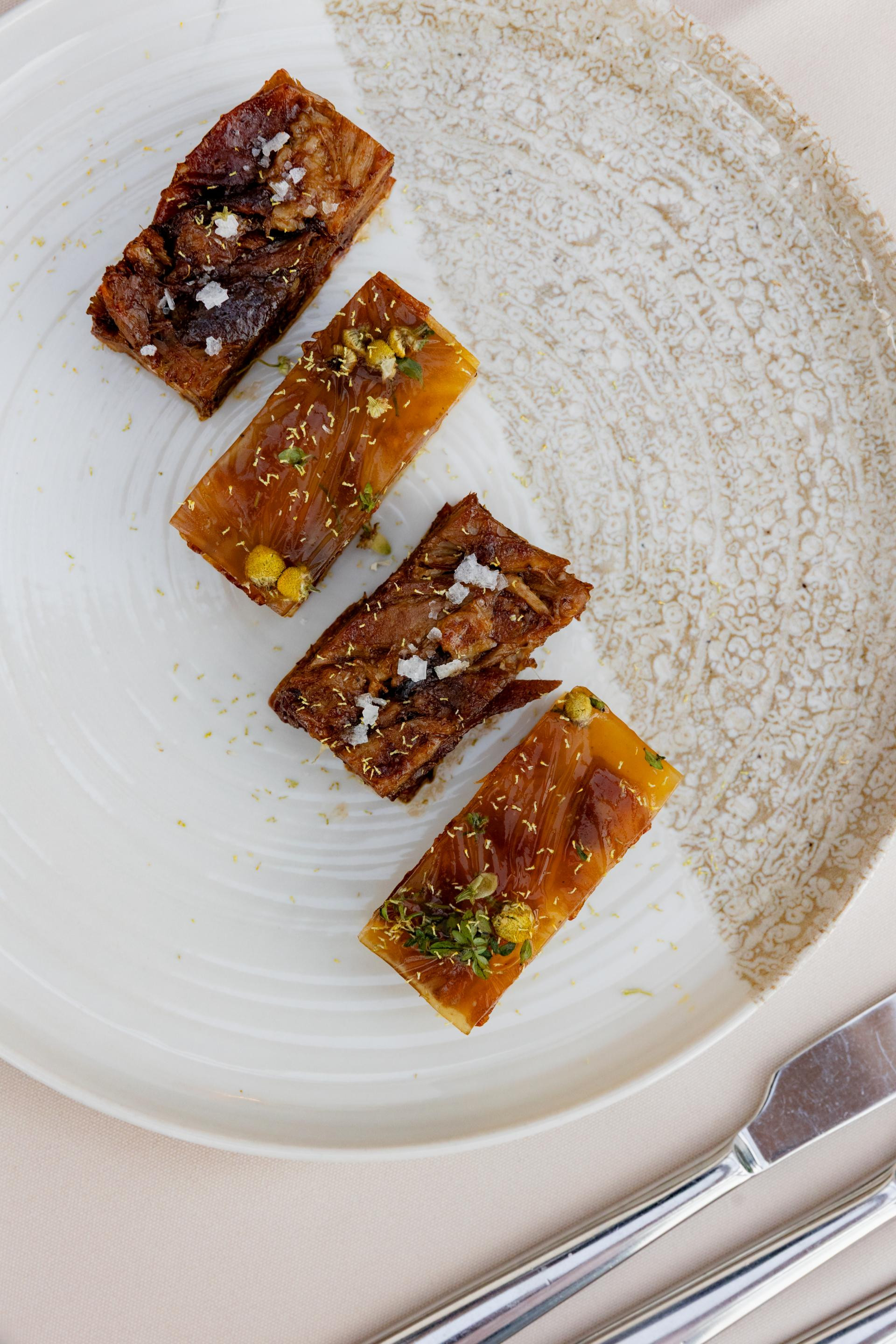 Namirnice su lokalne, ali bez namjere da budu folklorne: sipa, cherry rajčica, bosiljak, list, ružmarin, gljive, vrganji, kesten, fermentirano povrće. Kako dodaju iz Eaterije, chef gradi slojeve i svaki tanjur ima svoj tonalitet, od svježine prema punoći, od svijetlog prema tamnijem, od suzdržanog prema emotivnom. Tako su tu sipa tagliatelle sa cherry rajčicama, maslinovim uljem u prahu i perlama bosiljka, zatim file lista u brudetu s palentom i paljenim ružmarinom, krem juha od kiselog kupusa, gljiva, ječma i graha, pačja prsa s vrganjima, gljivama, karameliziranim češnjakom i vinom i Mont Blanc s kesten pireom.