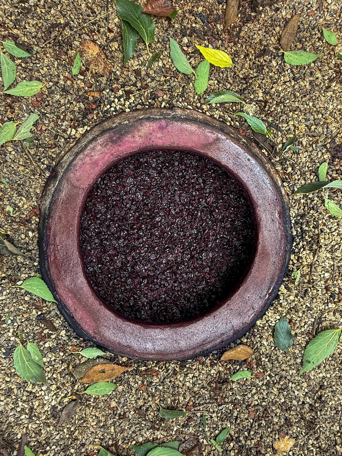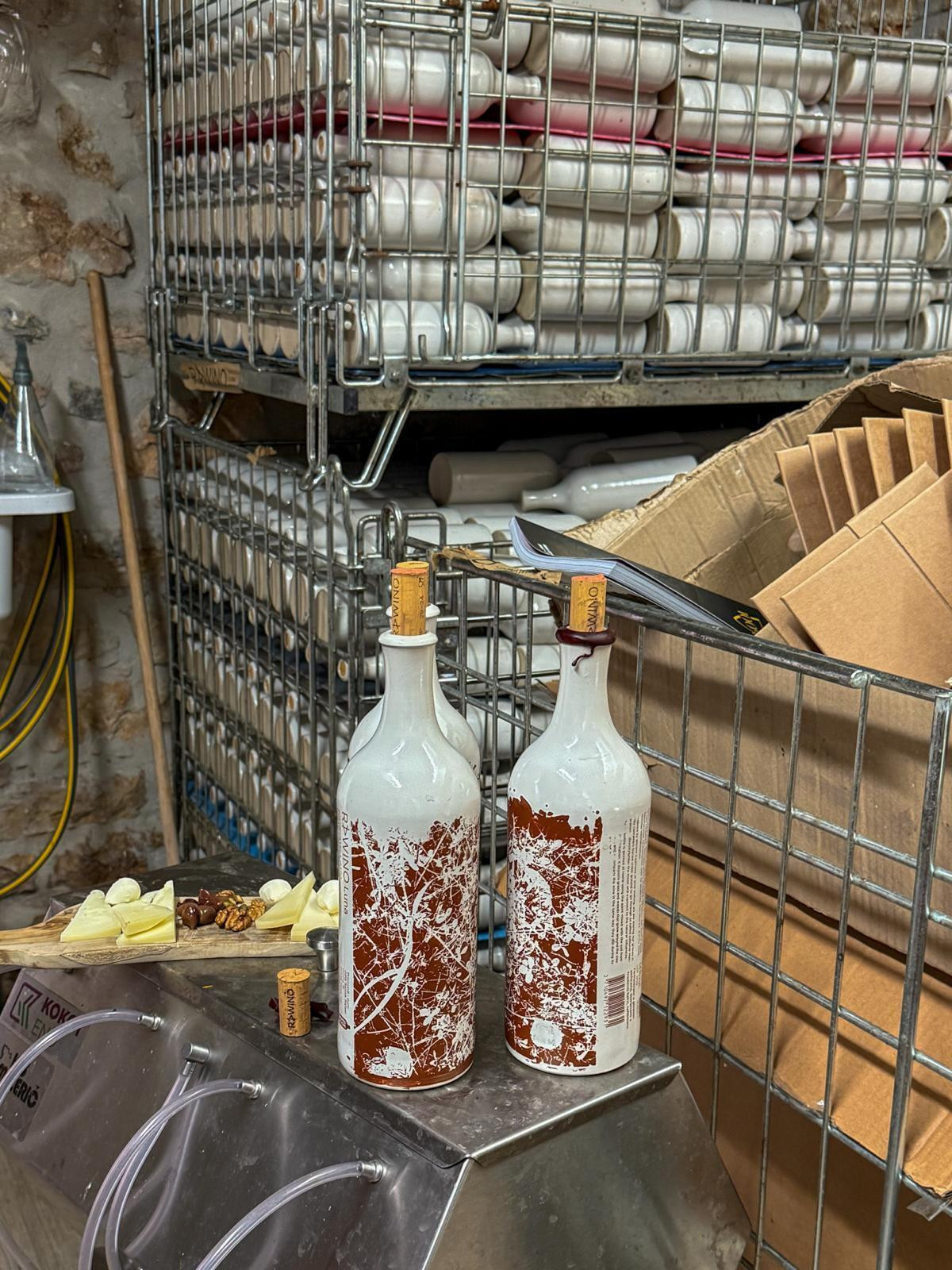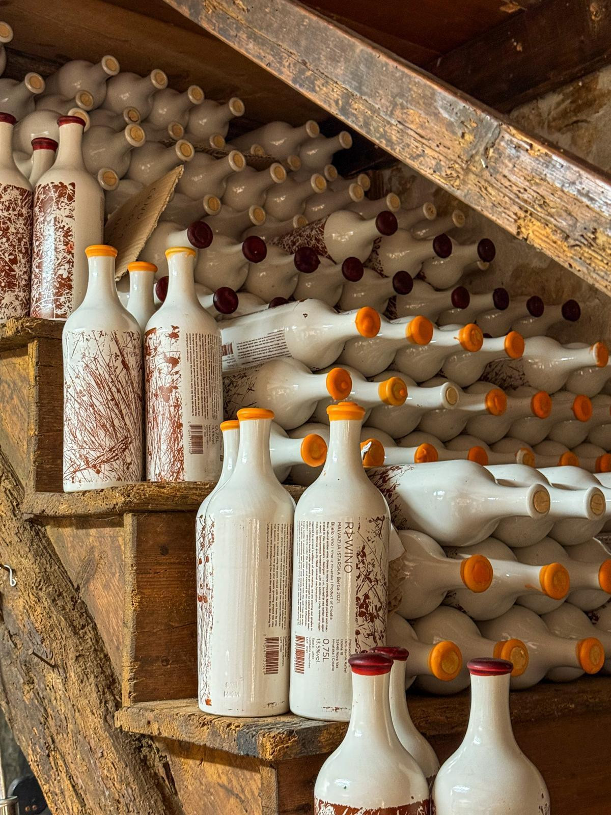 Kušanje započinjemo jantarnom Malvazijom. Prvo kušamo komponentu berbe 2023., direktno iz amfore u kojoj vino još dozrijeva. To je, objašnjava nam, otprilike četvrtina buduće kupaže. Ostatak čini ista berba odležana u drvenim bačvama. Cijeli proces je prirodan: grožđe ubrano u punoj zrelosti spontano fermentira u amforama na otvorenom, gdje macerira 6 do 9 mjeseci. Sumpor se dodaje minimalno, tek da se vino zaštiti. Rezultat, kad se komponente spoje, je vino koje je elegantno, gusto i sočno, prepuno zrelog voća poput marelice, s notama kvasca i izraženom mineralnošću. Iako alkohol doseže oko 14 %, vino je toplo, izbalansirano i iznenađujuće pitko, s dugotrajnim završetkom.