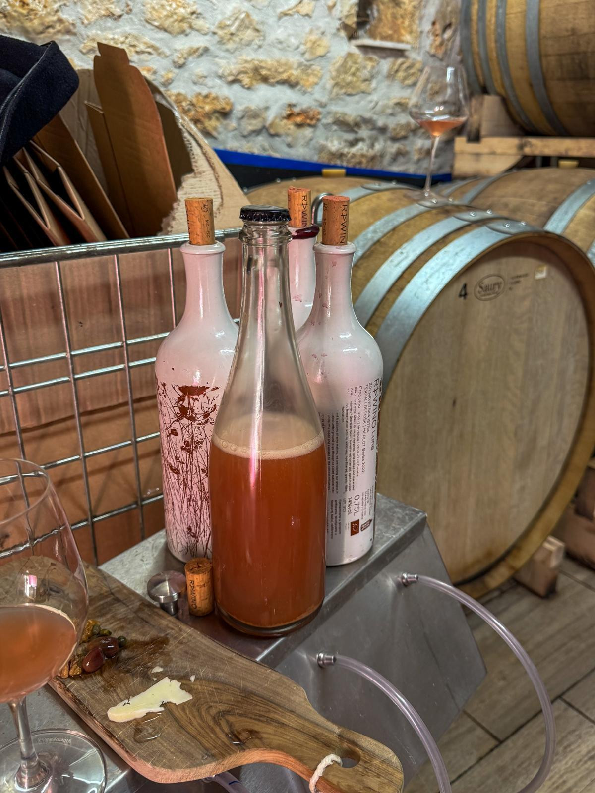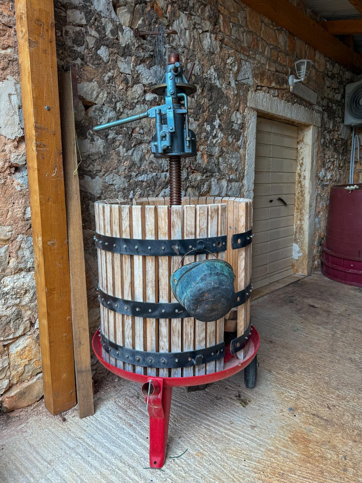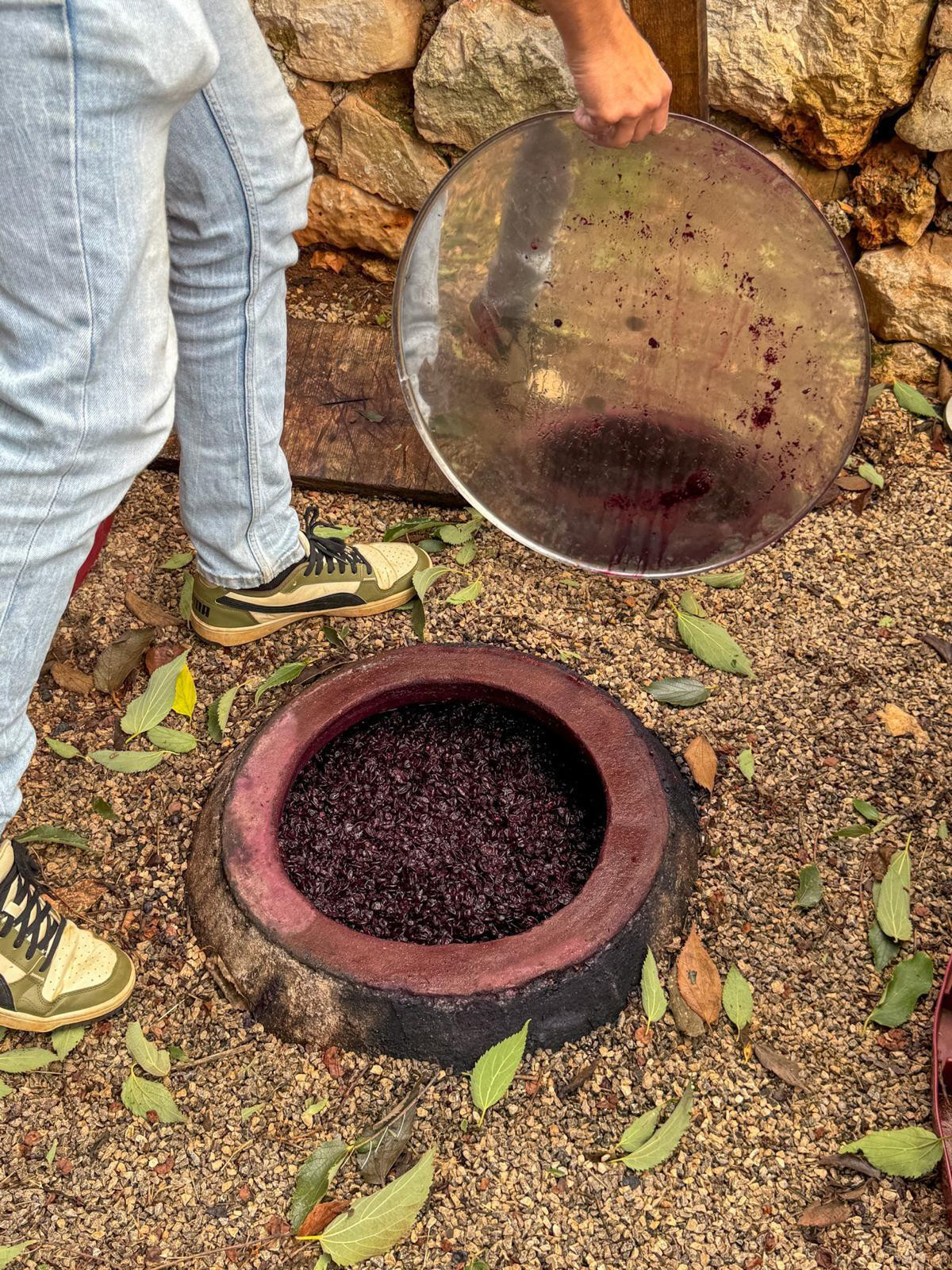 Kušanje započinjemo jantarnom Malvazijom. Prvo kušamo komponentu berbe 2023., direktno iz amfore u kojoj vino još dozrijeva. To je, objašnjava nam, otprilike četvrtina buduće kupaže. Ostatak čini ista berba odležana u drvenim bačvama. Cijeli proces je prirodan: grožđe ubrano u punoj zrelosti spontano fermentira u amforama na otvorenom, gdje macerira 6 do 9 mjeseci. Sumpor se dodaje minimalno, tek da se vino zaštiti. Rezultat, kad se komponente spoje, je vino koje je elegantno, gusto i sočno, prepuno zrelog voća poput marelice, s notama kvasca i izraženom mineralnošću. Iako alkohol doseže oko 14 %, vino je toplo, izbalansirano i iznenađujuće pitko, s dugotrajnim završetkom.