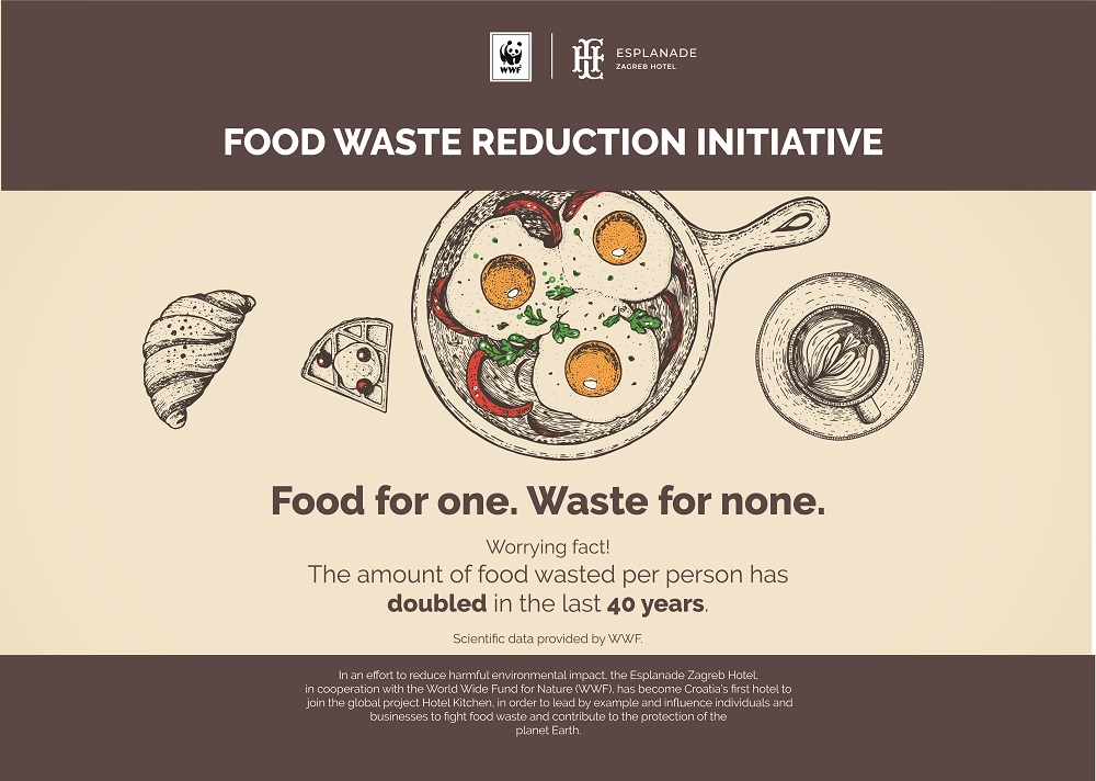 Procjena je da se u Europi baci oko 88 milijuna tona hrane, dok je 1/5 stanovništva izložena riziku od siromaštva. Količina hrane koja se na globalnoj razini baca više je nego dovoljna da nahrani svaku gladnu osobu na planetu. U zadnjih 40 godina je dvostruko porasla količina bačene hrane. Više od 50 milijuna tona voća i povrća uzgojenog u Europi odbačeno je svake godine samo zato što je izobličeno ili krive veličine. Ovo su samo neke od zabrinjavajućih činjenica koje su potaknule zagrebačku Esplanadu da se kao prvi hotel u Hrvatskoj i regiji priključi globalnom projektu 'Food Waste' WWF-a (Svjetske organizacija za zaštitu prirode) nastojeći pridonijeti smanjivanju otpada od hrane te tako smanjiti svoj štetan utjecaj na okoliš i Planet Zemlju.