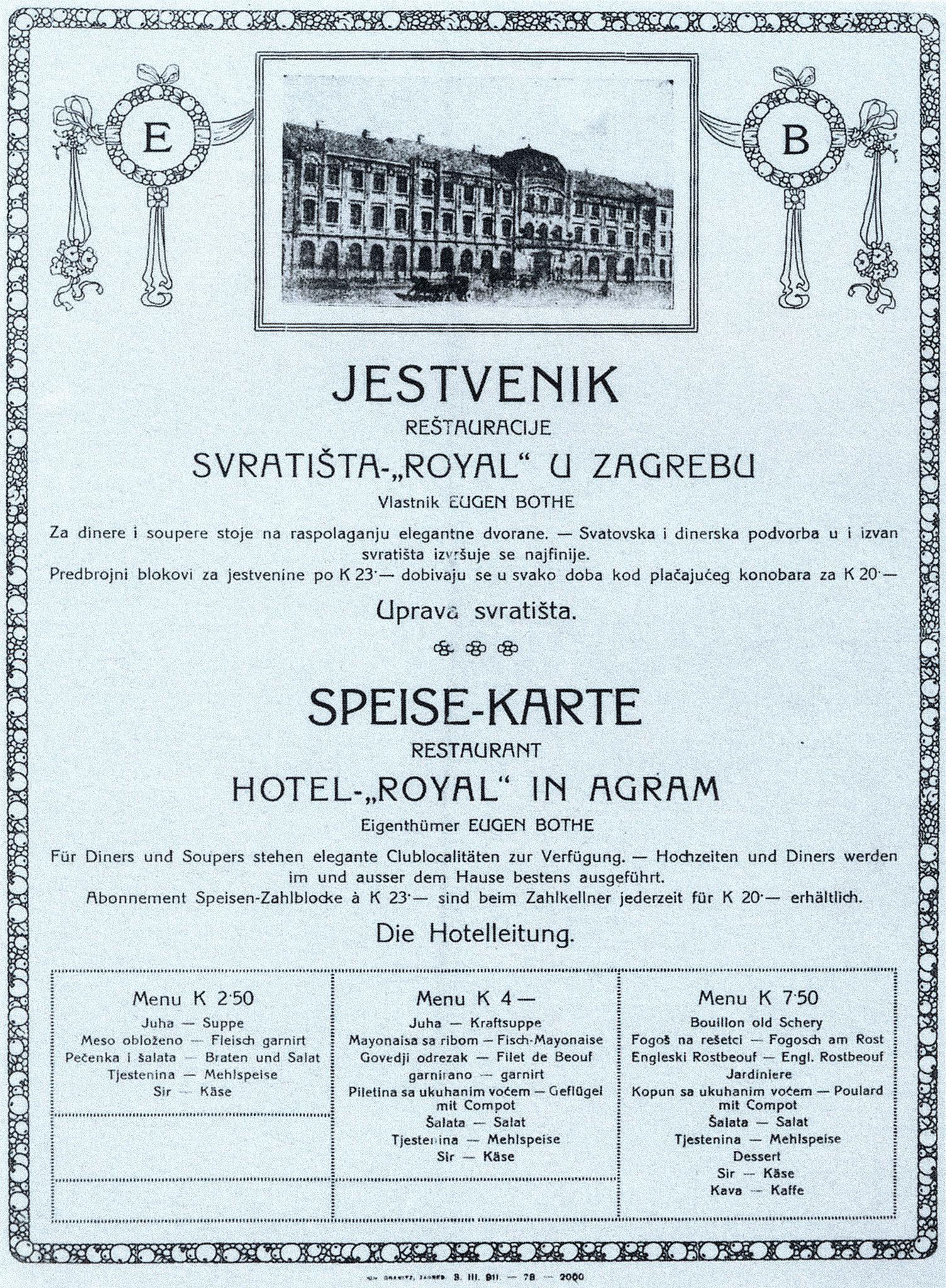 Ta prošla vremena kojih se mnogi i danas sjete, ali ih i štuju, zanimljiva su iz više razloga. Dok jedne zanima kako se grad razvijao, druge impresionira arhitektura ili umjetnost. Nas je, pak, zaintrigirao jelovnik odnosno "Jestvenik Reštauracije Svratišta ‘Royal‘ u Zagrebu", tadašnjeg vlasnika Eugena Bothe iz 1905. na koji smo sasvim slučajno naletjeli u Facebook grupi Zagreb - kakav je bio nekada.
