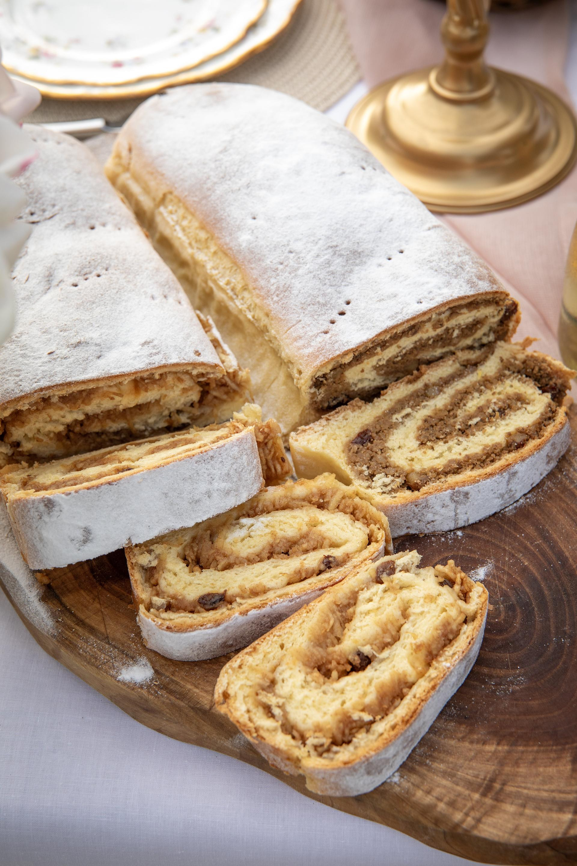 Pomiješati šećer, 200 g brašna, izmrvljeni kvasac i mlako mlijeko pa ostaviti "da nadođe" 10-15 minuta. Nakon toga dodati ulje, ribanu koricu limuna, punomasno kiselo vrhnje, žumanjke i vanilin šećer. Sve dobro izmiješati pa u posebnoj posudi promiješati preostalih 700 g brašna i sol. Sada u smjesu postupno dodavati brašno i umijesiti tijesto koje mora biti malo ljepljivo i kojemu se ni slučajno ne smije dodavati još brašna jer će u pečenju ostati presuho i puknuti sa strane. Kada ste umijesili tijesto, ostavite ga pokrivenog da se diže, isprva samo pola sata da se udvostruči. Nakon toga tijesto promijesite i ostavite sat vremena da se utrostruči. Dok tijesto raste, priprema se nadjev tako da se svi pripremljeni elementi izmiješaju i sjedine. Nakon što se tijesto utrostručilo, razvaljajte ga u dvije odvojene cjeline, na njega nanesite nadjev, zarolajte i premažite razmućenim jajem. Pri pečenju dvije role odvojite masnim papirom da se ne spoje i da ostanu zaobljene. Pecite 35 minuta na 180 stupnjeva.