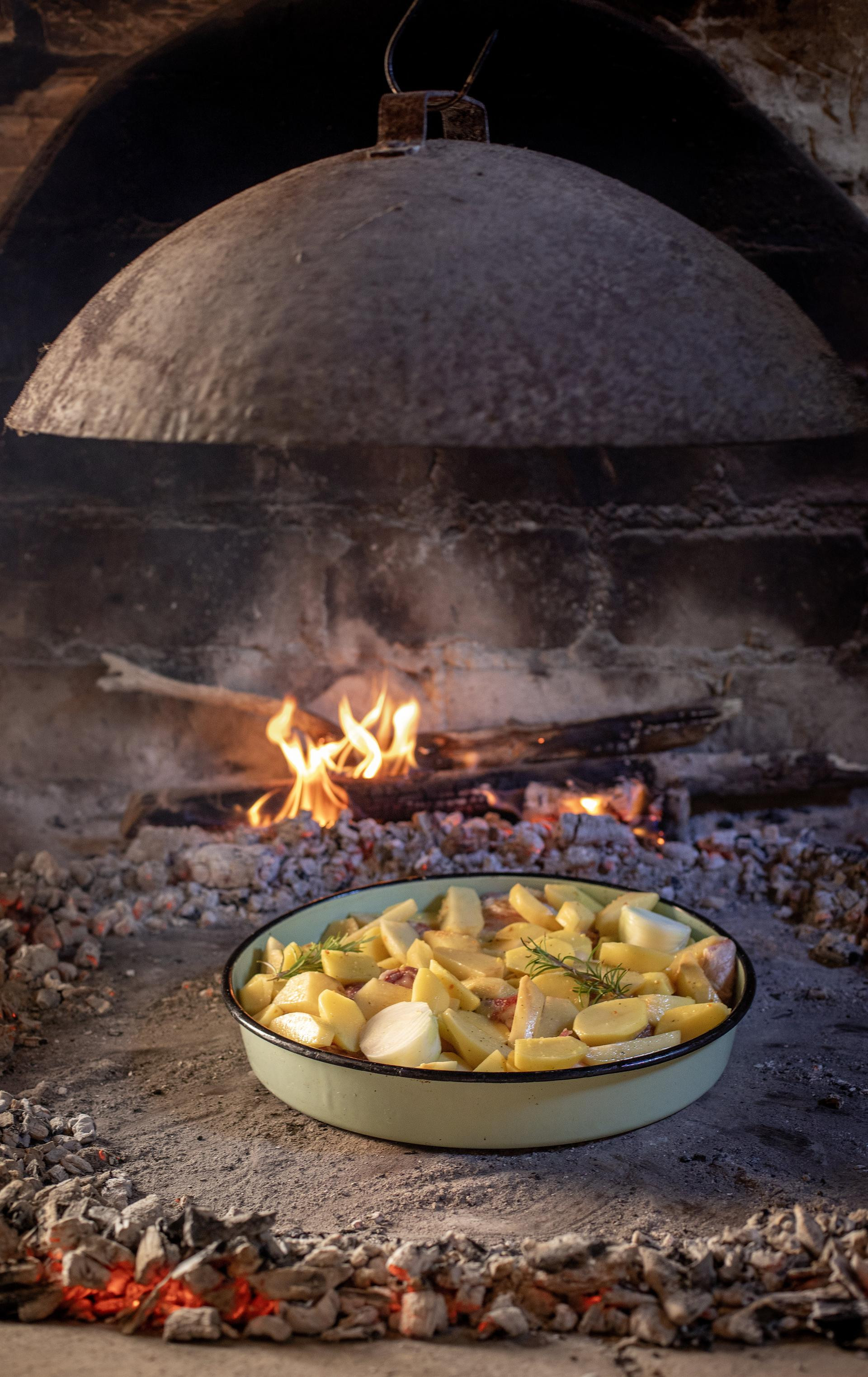 Ispred Mirjanine obiteljske kuće zatekli smo njenog supruga Antu kako u ruci drži okruglu roštijeru (škrovadu, plitki pekač) napunjenu svježim "blagom božjim". Ante je već dobro ugrijan, o čemu svjedoči znoj koji mu se cijedi niz lice. Kako i ne bi kad je na 35 Celzijevih u hladu punih sat vremena ložio vatru kako bi pripremio komin za peku. U roštijeri je janjeća peka, jedan od sljedova koje je Mirjana odredila servirati te večeri.