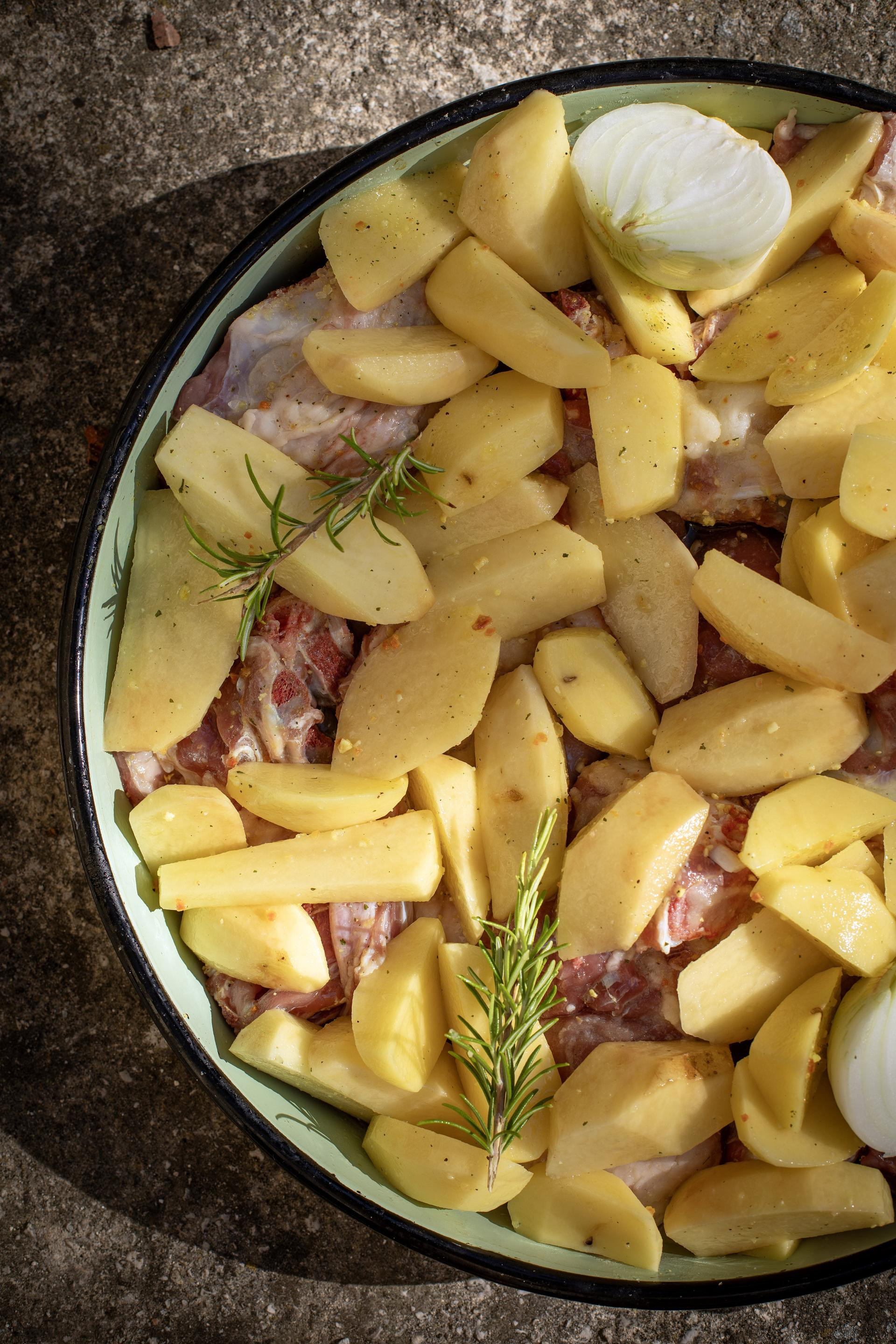 "Peka je svima dragi zalogaj. Za ovu prigodu u roštijeru smo stavili oko 3,5 kilograma mlade janjetine koju smo nabavili od jednog ovčara iz sela Bitelić. Janje je sisalo samo majčino mlijeko, a majka je pasla škrtu, ničim zagađeni travu. Ekološki sto posto. Stavili smo otprilike jednaku količinu krumpira, koji je Ante iskopao iz našega vrta. Iz istoga vrta su i jedna kapula te mala kitica ružmarina. Roštijeru sam prije punjenja namazala domaćom svinjskom masti, sve skupa posolila i sada je na Anti da on obavi svoj dio posla. Ne sumnjam u njega jer ih je ispekao bezbroj", objašnjava nam domaćica kako se priprema jedna od delicija vrlo cijenjenih u sinjskoj, alkarskoj krajini.