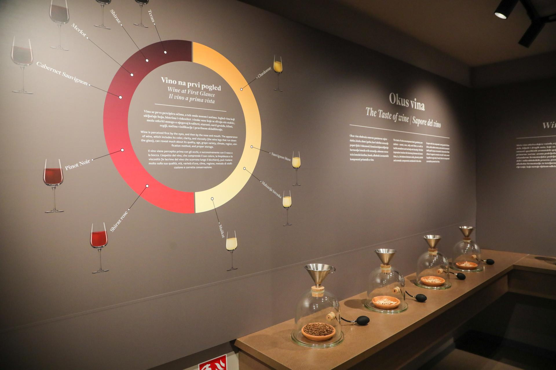 Muzej nudi i brojne multimedijalne sadržaje: posjetitelji mogu sudjelovati u interaktivnim prezentacijama, čuti zvukove vinograda, slušati pjesme posvećene vinu ili u sobi senzorike prepoznavati mirise poput meda, kave i cvijeća. U središtu postava nalazi se instalacija koja prikazuje četiri vrste istarskog tla, crljenicu, bijelu, sivu i crnu zemlju, te skulptura od čokota stoljetnog terana iz vinograda Josipa Brečevića Pepija.