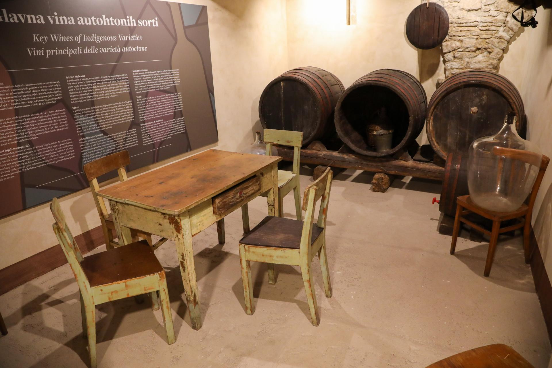 Muzej detaljno predstavlja autohtone sorte, malvaziju, teran, borgonju, muškat momjanski, duraniju i hrvaticu, te prikazuje kako tlo, klima i rad vinara oblikuju njihov karakter. Edukativni dio uključuje prikaz vinogradarskih radova kroz četiri godišnja doba te procese prerade i čuvanja vina.