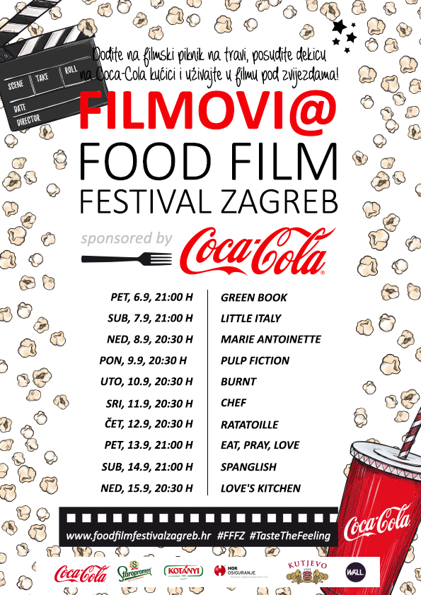 Njegova posebnost je što u sam centar grada, u najljepši zagrebački park Zrinjevac donosi filmske projekcije pod zvijezdama. Svaku večer tijekom deset dana, od idućeg petka pa sve do 15. rujna, svaku ćemo večer na dekicama moći uživati u nekim od kultnih foodie filmova ili filmova s kultnim foodie scenama. Sve započinje filmom koji je ove godine dobio Oscara za najbolji film, kao i za originalni scenarij i najbolju sporednu mušku ulogu– Green book, a nastavlja se filmovima Little Italy koji je krajem prošle godine igrao u kinima, Marie Antoinette Sofie Coppole s Kirsten Dunst u glavnoj ulozi, kultnim Pulp Fictionom Quentina Tarantina, Burntom s odličnom glumačkom postavom na čelu s Bradleyom Cooperom, filmom Chef koji je jedan od najomiljenijih foodie filmova u kojem glavnu ulogu ima kralj svih sendviča – cubano, zatim također kultnim i Oscarom nagrađenim animiranim filmom Ratatouille, filmom Eat, pray, love po istoimenoj knjizi s predivnom Julijom Roberts u glavnoj ulozi te filmovima Spanglish i Love's kitchen. Dekice, jastučiće, tepihe te ležaljke posjetitelji mogu posuditi na licu mjesta, na info kućici Coca-Cole na šetnici uz livadu.