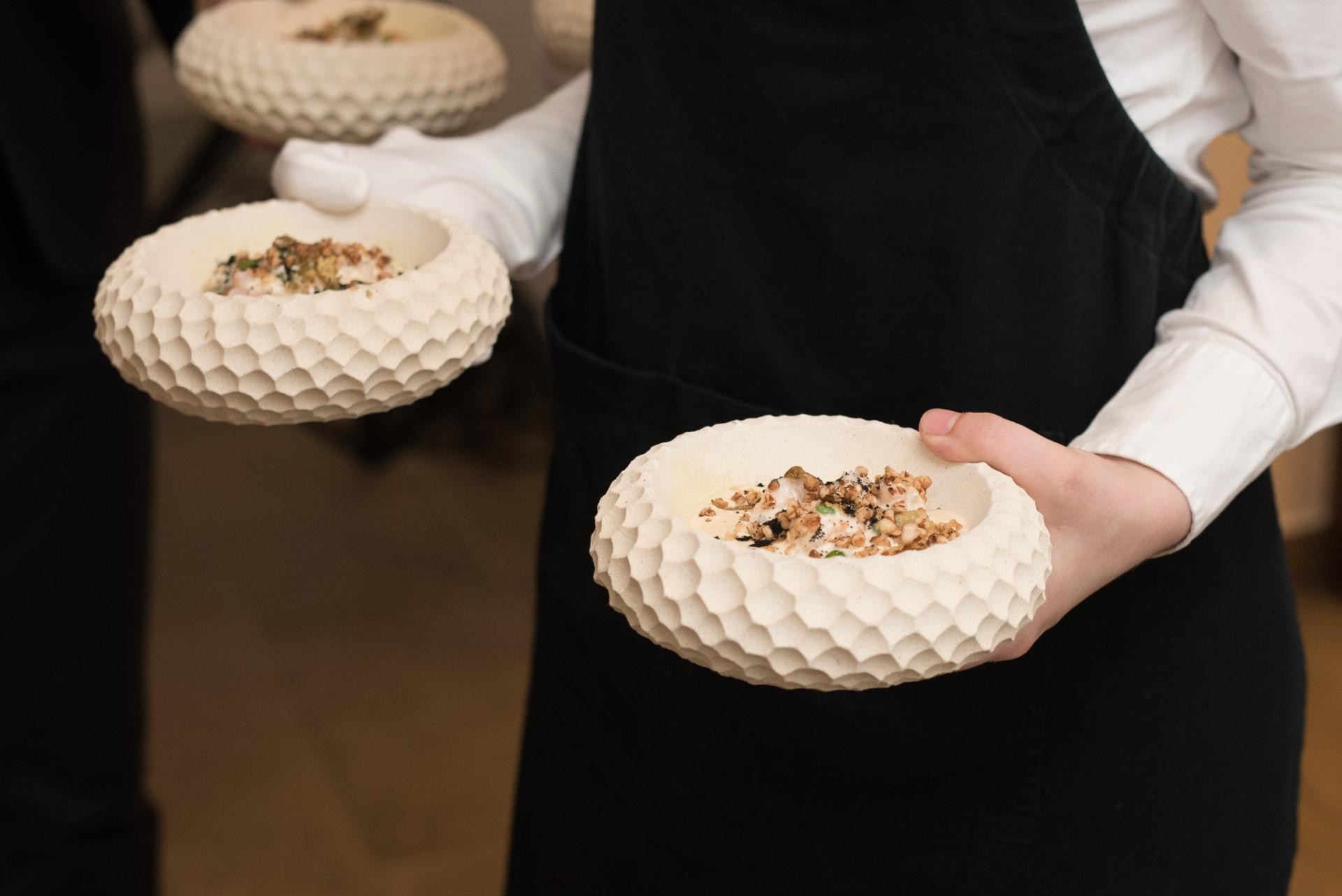Večera je otpočela hladnim predjelom - salatom od bonela graha (koji naši kajkavci ponegdje zovu i žohar). Grah je, naravno, bio iz biodinamičkog uzgoja, a Kroflin ga je začinio domaćim bučinim uljem i odležanim vinskim octom (iz 1996., od pelješkog vinara Frana Miloša), dodavši joj i ukiseljene lisičice, samoniklu kiselicu, usoljenu guščju jetru i svoj domaći miso od graha. Poznavatelji Kroflinove visoke kuhinje prepoznat će njegov klasik iz zagrebačkog restorana ManO2, gdje je on višegodišnji glavni chef, no tek smo sad zapravo uočili koliko se, već u tom predjelu, inspirira tradicijom. Kroflin, koji je osobno predstavio svaki slijed ove večere, dok je Špiranec predstavljao vina, to je i sam potvrdio, istaknuvši kako i sam djelomično vuče korijene iz zagorskoga kraja. Uz to vrlo uspješno predjelo poslužen je Rajnski rizling 2023 OPG-a Herceg, najbolje ocijenjeno vino u grupi bijelih mirnih vina redovite berbe s ostatkom šećera, koji je Špiranec također naveo kao sortu koja je dobrodošla u ovom dijelu Bregovite Hrvatske.