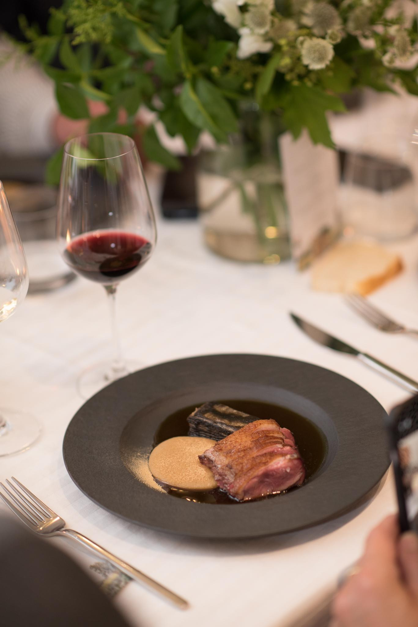 Glavno jelo bila je još jedna senzacija iz portfelja velikog majstora: odležana pačja prsa s kremom od mlinaca i misa od kruha, pačji jus, mille feuille od mladog celera pečenog u soli i maslac od crnih trubača. Iako nema smisla dekonstruirati ovaj skladni tanjur, što se nas tiče, sočnim, vrlo ukusnim tankim fetama pačjih prsa na tanjuru je glavnu ulogu preuzeo slasni mille feuille od celera, izvrstan zalogaj koji ćemo još dugo pamtiti. Kako i priliči patki, čaše za stolom napunjene su crnim vinom - ne, doduše, uobičajenim crnim pinotom, nego izvrsnom, vrlo svježom i živahnom kupažom cabernet sauvignona i merlota Vuglec Passion 2022.