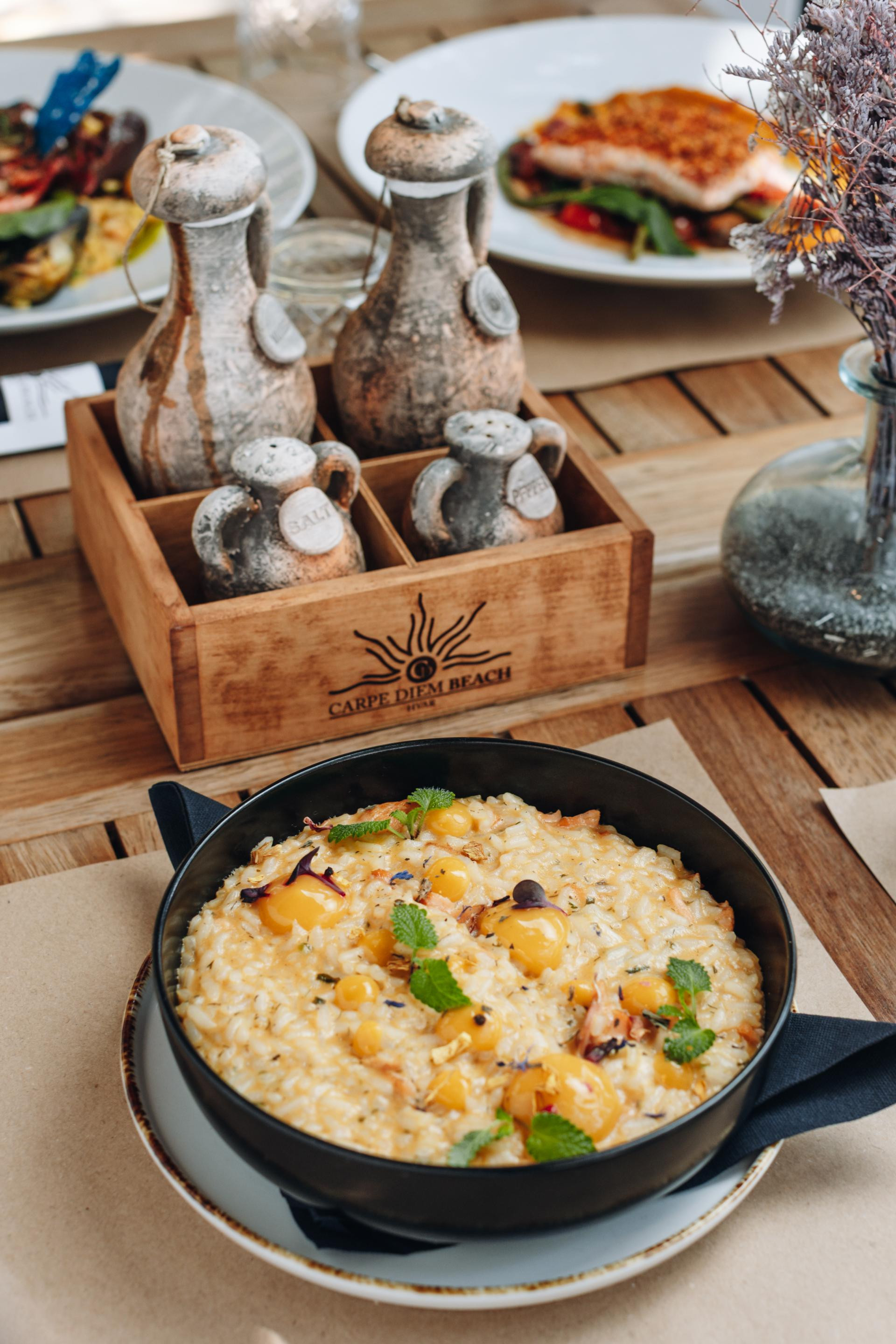 Hrana u Carpe Diem Beachu prati duh otoka: svježa, organska, s jasnim okusom mediterana. Svake godine kuhar Kristijan Brčić i sushi majstorica Ana Strukar osmišljavaju novitete u jelovniku, pažljivo birajući svaki sastojak i spajajući svježinu, kvalitetu i kreativnost u savršenu harmoniju.