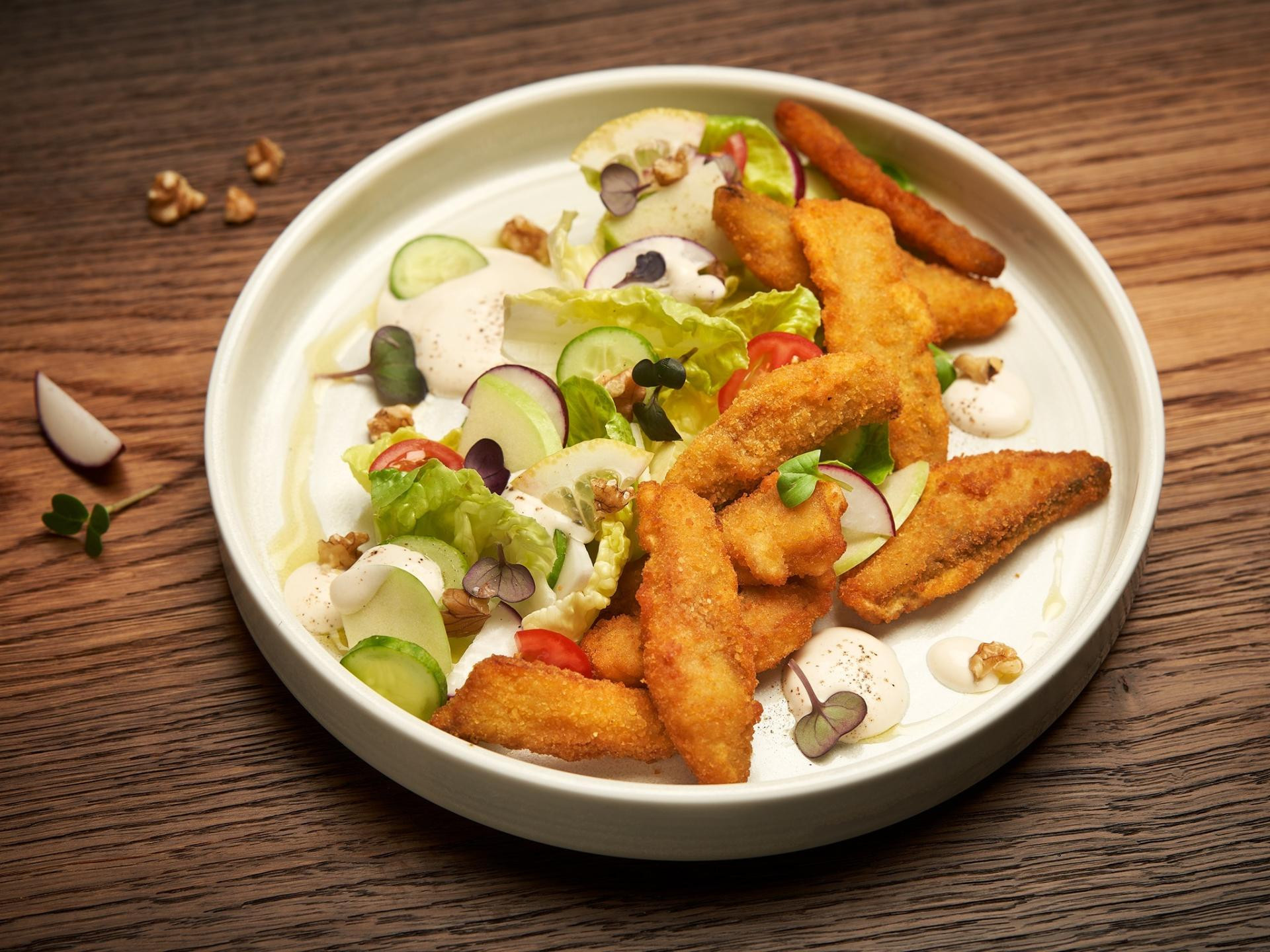 Priprema: Svo povrće narežite na manje dijelove i stavite u zdjelu. Prelijte maslinovim uljem i limunovim sokom ili octom. Začinite solju i paprom, dobro promiješajte. Posipajte nasjeckanim začinskim biljem i poslužite uz Fishchips Classic koji brzo i jednostavno pripremite po uputi na pakiranju.