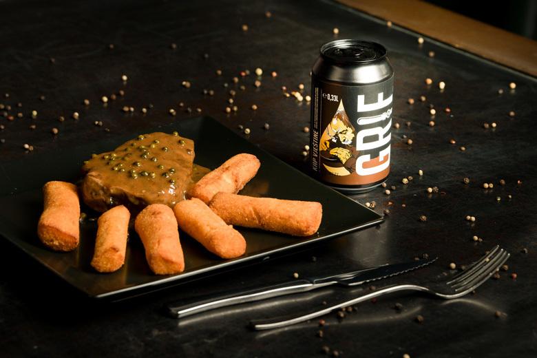 Steak od otprilike 0.250 do 0.300 grama kratko zapečemo u tavici i napravimo tamni umak od pečenja. Zatim dodamo zeleni papar u salamuri te kratko prokuhamo, a potom pečemo biftek na grilu te ga kratko prokuhamo u umaku. Poslužimo s kroketima ili njokima i Grifovim Oatmeal Stout crnim pivom kojem zobene pahuljice daju bogatstvo i punoću okusa.
