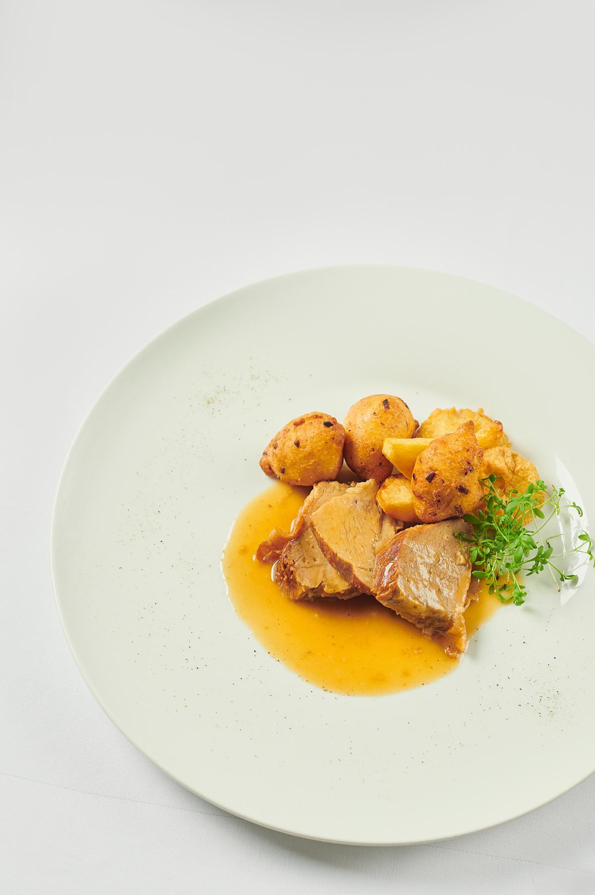 Sporo pečena teletina s fritulicama od poriluka, tikvicama u tempuri i pečenim krumpirom
