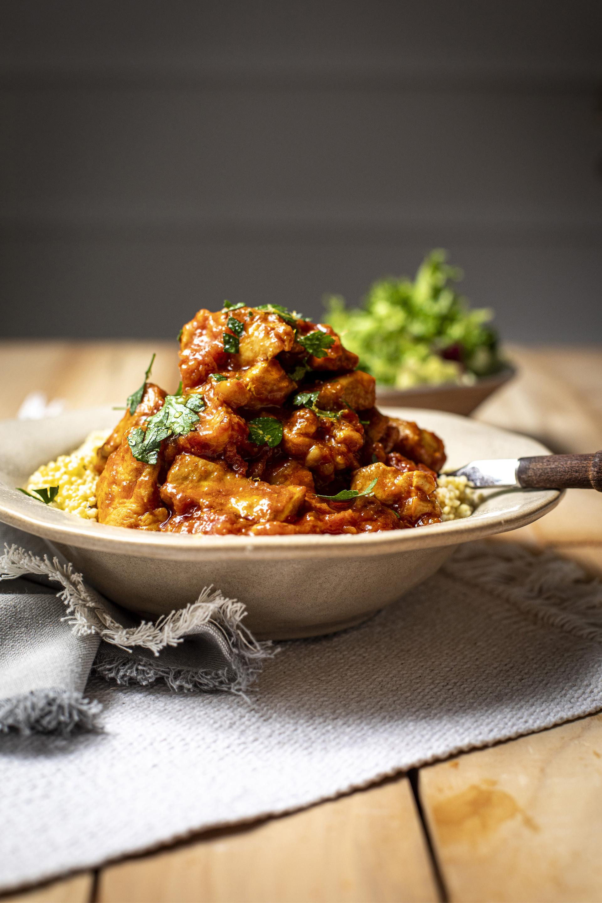Maslinovo ulje ulijte u veliku duboku tavu i zagrijte. Luk sitno nasjeckajte i lagano dinstajte. Kada luk omekša, dodajte protisnuti češnjak, naribani đumbir, listove timijana, mljevenu kurkumu, cimet, dimljenu papriku i čili pahuljice pa pirjajte nekoliko minuta, dok začini ne zamirišu. Sada dodajte nasjeckanu piletinu i malo soli. Miješajte meso dok ne bude dobro obloženo začinima. Meso kratko ispržite. Mesu dodajte nasjeckanu rajčicu, temeljac i med. Lagano pirjajte dok meso ne omekša. Pri kraju umiješajte koricu limuna i nasjeckani korijander. Jelo poslužite s prosom koji ste pripremili prema uputama na pakiranju. Prilikom serviranja jelu možete dodati koju kap maslinovog ulja.