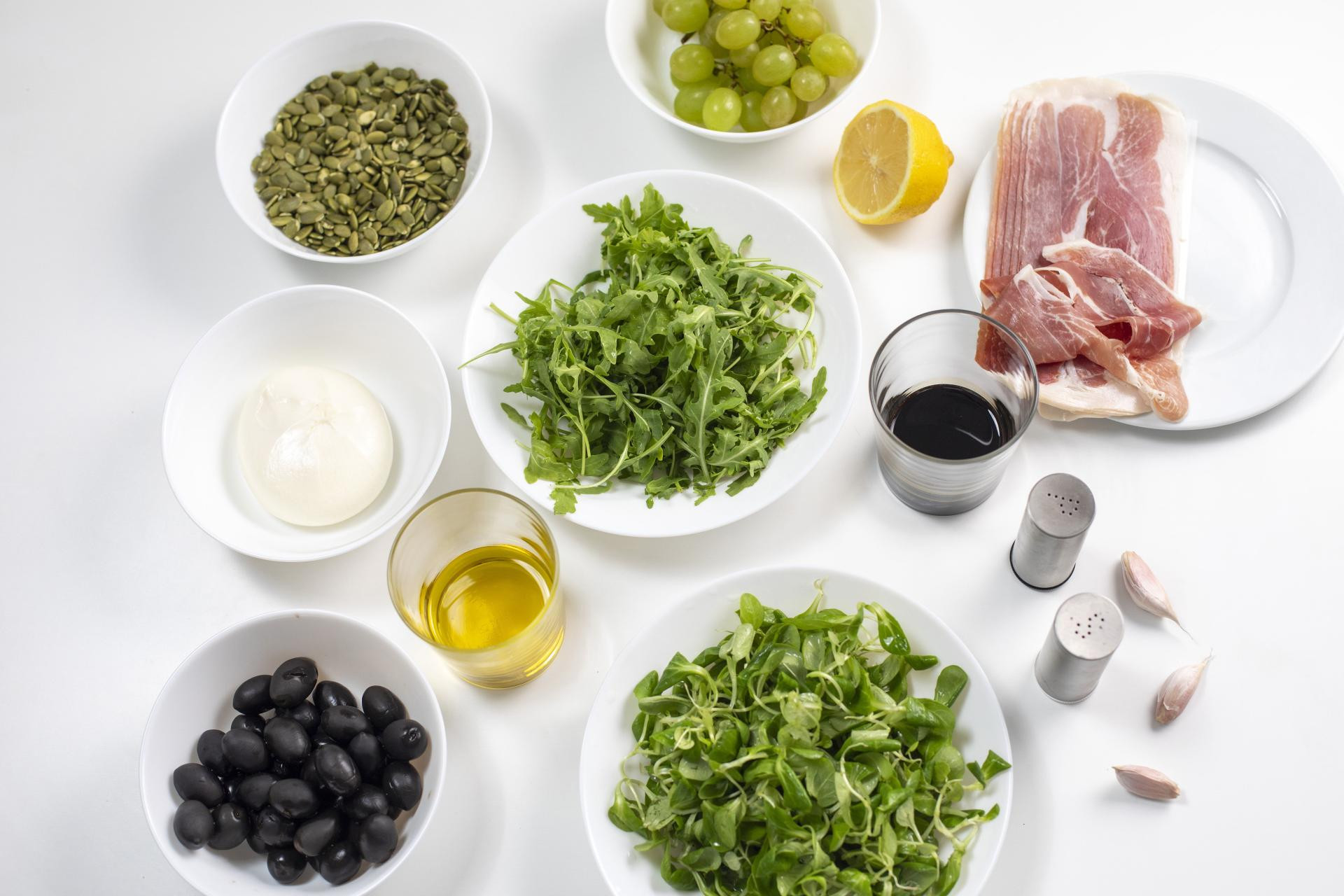 U manjoj zdjelici pomiješajte maslinovo ulje, balzamični ocat, limunov sok, sitno sjeckani češnjak, prstohvat soli i svježe mljeveni papar. Dobro promiješajte dok se sastojci ne povežu u aromatičan preljev. Operite i osušite listove radiča i matovilca. Na veliki tanjur ili plitku zdjelu najprije rasporedite radič, a preko njega dodajte matovilac. Na lisnatu podlogu rasporedite prepolovljene bobice grožđa i crne masline. Pospite bučinim sjemenkama, ostavljajući dio sa strane za završno dekoriranje. Burratu pažljivo stavite u središte tanjura. Oko nje lagano zarolajte kriške pršuta. Prelijte sve pripremljenim dresingom, pazeći da zahvati i listove salate i samu burratu. Završite s još malo bučinih sjemenki za dodatnu teksturu. Salatu poslužite odmah, uz svježe pečeni kruh.