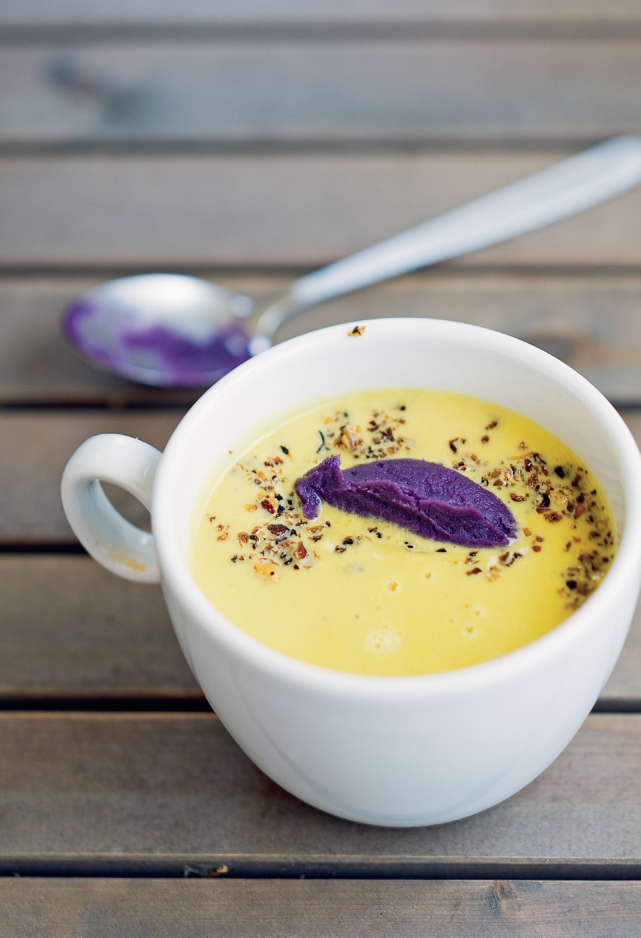 Na maslinovom ulju 10-ak minuta propirajati luk, češnjak i batat. Dodati sve ostale sastojke, osim papra, i kuhati 25 - 35 minuta. Usitniti mikserom i propasirati.