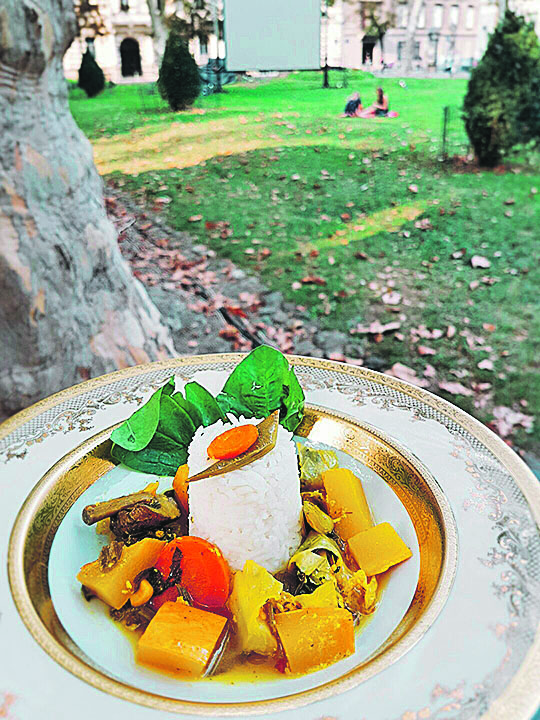 Meso sa začinima i đumbirom staviti u hladnu posudu bez dodavanja ikakve masnoće. Sve preliti jogurtom. Pet minuta kuhati poklopljeno srednje jakoj vatri pa još 1 sat na najmanjoj laganoj vatri. Na kraju dodati sve nasjeckano povrće i poklopljeno kuhati još nekoliko minuta na niskoj temperaturi (najviše 10 minuta). Poslužiti uz basmati rižu.