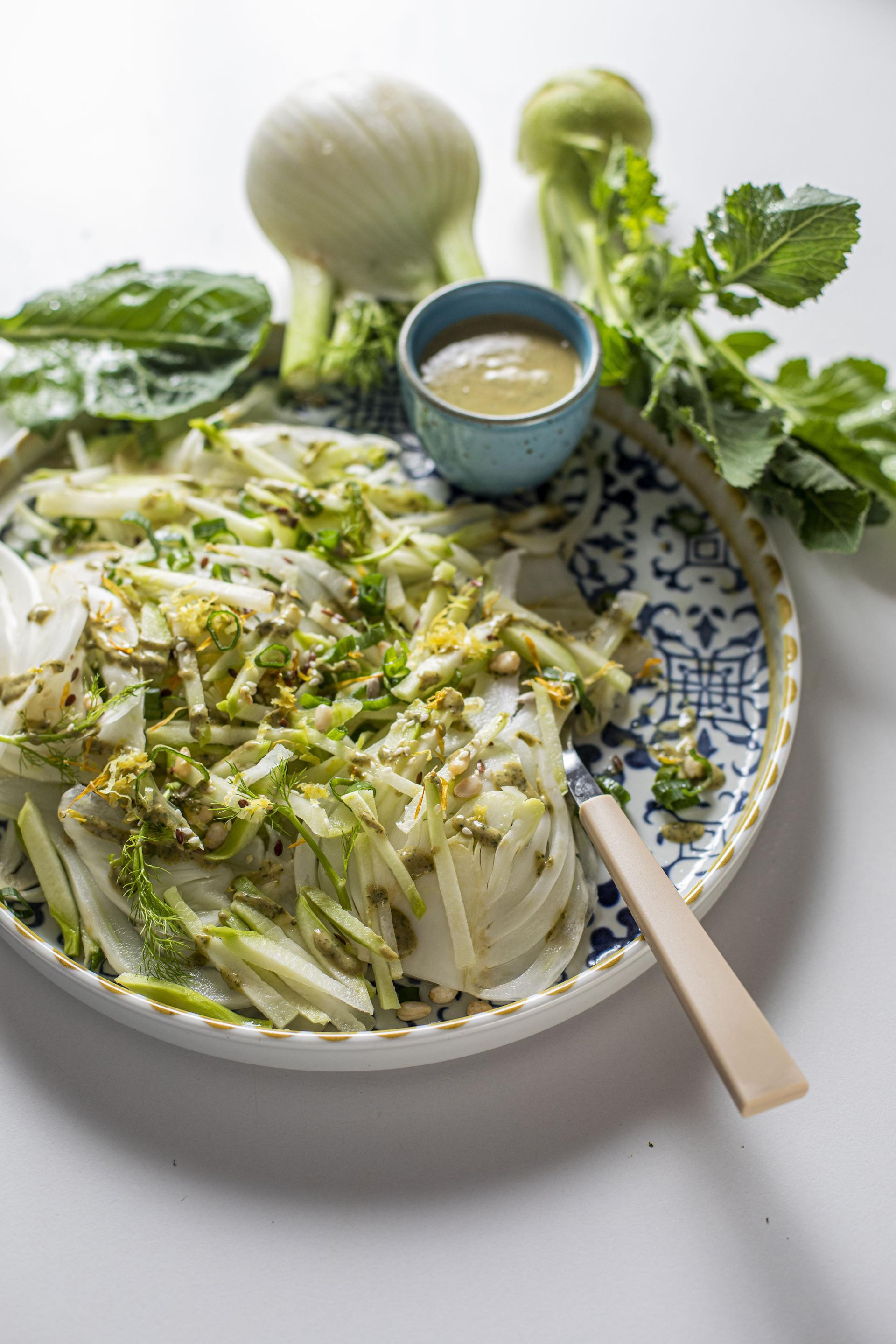 Ova salata, u kojoj glavnu ulogu igraju korabica i komorač, lijepo je osvježenje u moru već isprobanih i poznatih kombinacija. Osim toga, dressing od limuna, tahinija, senfa i javorovog sirupa također će biti lijep zaokret i jelu će dati dozu orašastog okusa i kiselosti, pa se vrlo lako može dogoditi da baš ovo jelo vama i vašim gostima bude najzanimljiviji dio, recimo, druženja uz roštilj.