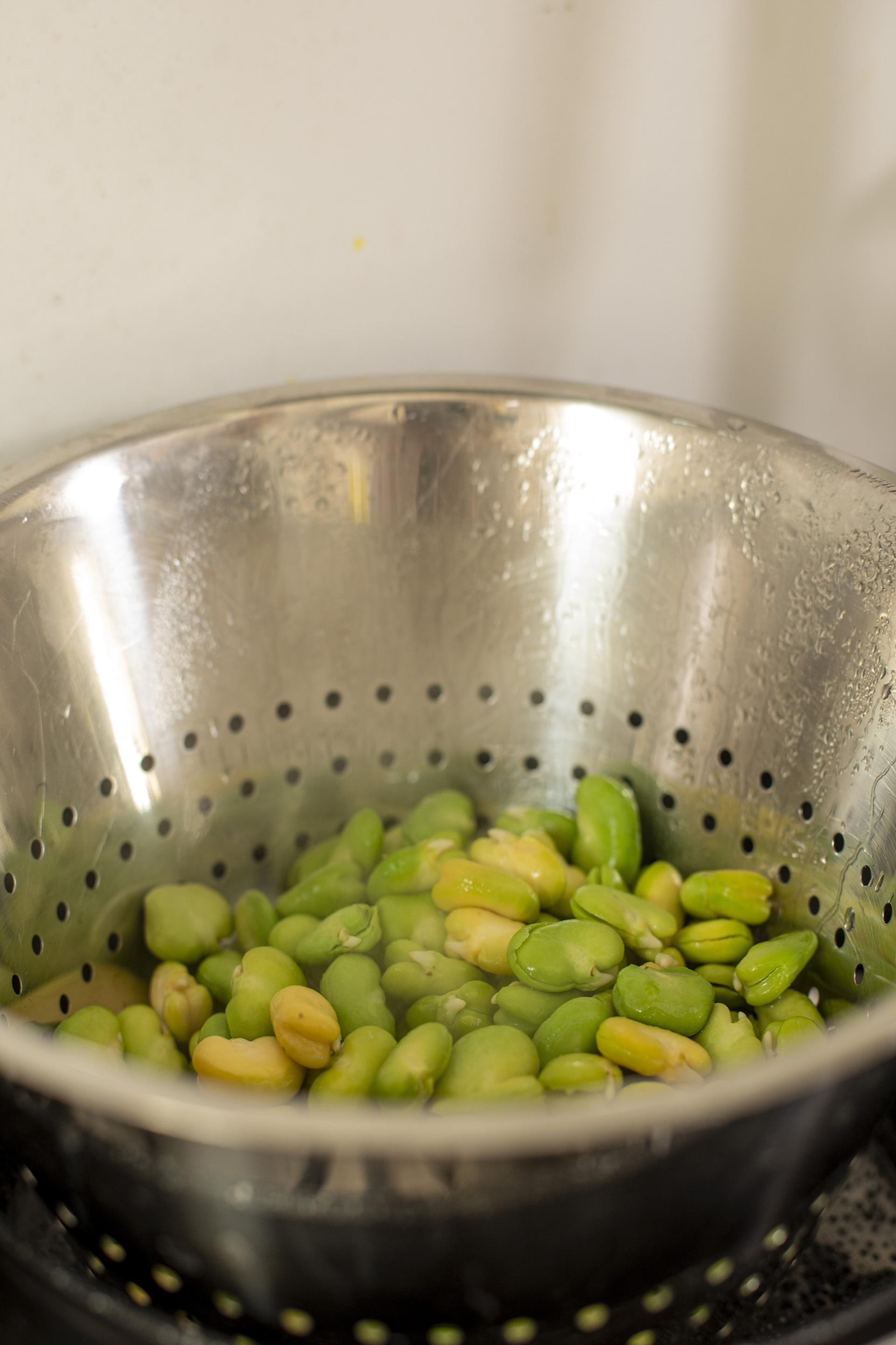 Dok se meso peče, bob kratko prokuhajte i ogulite ako je potrebno. Pomiješajte s uljem, limetom, soli i paprom.
