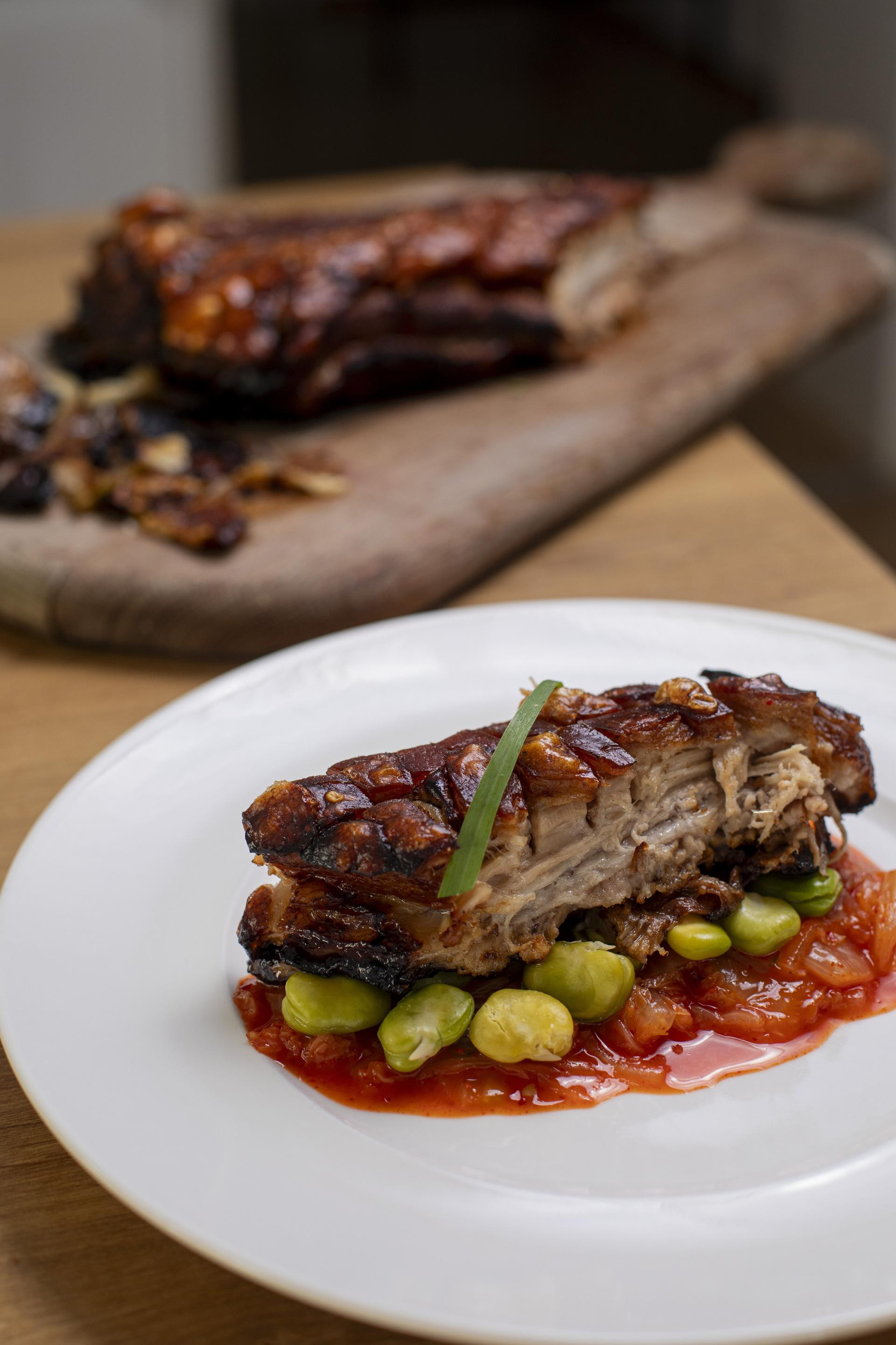 Pitaj bilo kojeg kuhara koji se uhvatio u koštac s potrbušinom: hrskava koža je sveti gral pečenja svinjetine. Osnovna ideja je izvući vlagu iz kože, a to se u Kini tradicionalno postiže sušenjem na suncu, na Filipinima se prvo kuha u vodi pa prži, a u Vijetnamu se koristi soda bikarbona. Odlučio sam se ipak za kombinaciju malih dijamanata urezanih u kožu čiji je uzorak evocirao mitološke zmajeve iz legendi Istoka. Kako bih pokušao izvući vlagu iz kože, utrljao sam na nju malo naribane kore od limete i sol, pazeći pritom da marinada koja je također bila slana od soja-sosa ne dotiče zmajevu površinu.