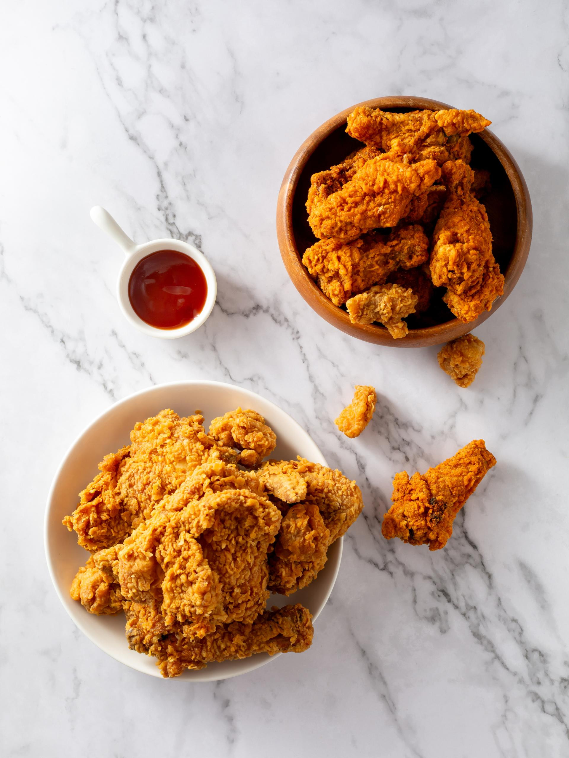 U velikoj zdjeli pomiješajte brašno sa svim začinima i ostavite sa strane. U drugoj velikoj zdjeli umutite mlaćenicu i jaje dok se ne sjedine. Dodajte komade piletine u zdjelu s mlaćenicom, dobro ih obložite i pokrijte plastičnom folijom ili poklopcem. Ostavite da stoji barem 30 minuta ili preko noći. Ako stoji dulje od 30 minuta, spremite u hladnjak. Zagrijte pećnicu na 80 °C. Pleh obložite aluminijskom folijom, na njega stavite rešetku i ostavite sa strane. U dubokom loncu ili fritezi zagrijte oko 7–8 cm ulja. Ako koristite električnu fritezu, napunite do oznake MAX. Zagrijte ulje na 175 °C. Kad postigne temperaturu, smanjite vatru na srednju. Izvadite komad piletine iz mlaćenice, pustite da se ocijedi višak tekućine, zatim ga uvaljajte u mješavinu brašna i začina, dobro pritisnite da se obloži sa svih strana. Otresite višak i pažljivo spustite u vruće ulje. Pržite po 3–4 komada odjednom oko 12 minuta, okrećući na pola vremena, dok ne postanu zlatno-smeđi. Pržene komade stavite na pripremljeni pleh i ubacite u pećnicu. Dopustite ulju da se ponovno zagrije prije dodavanja novih komada i ponovite postupak s ostatkom piletine. Kad je sve gotovo, provjerite da je unutarnja temperatura mesa 75 °C.