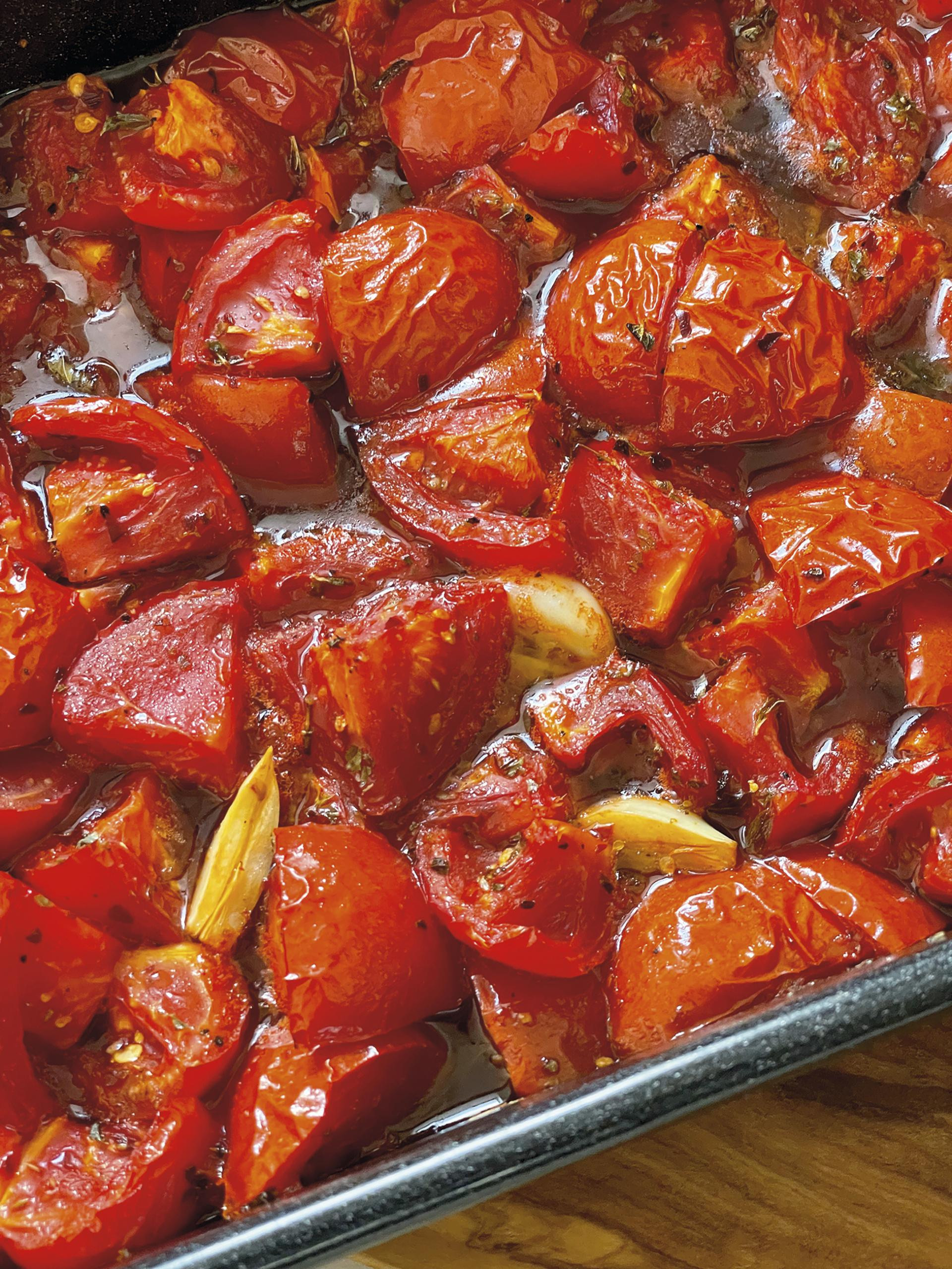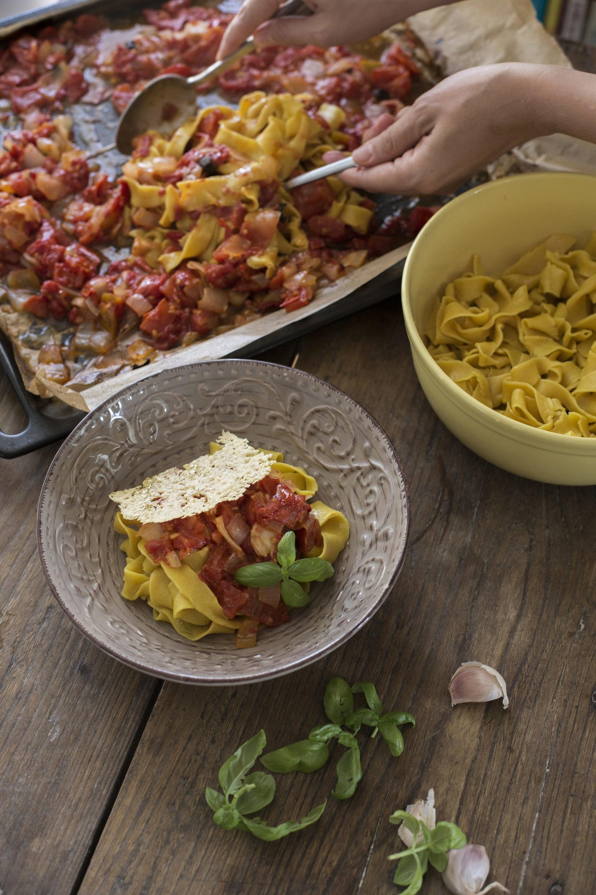 Umak je gotov kad je tekućina isparila, a on postao gust. Izvadite pleh i stražnjom stranom žlice lagano zgnječite sve sastojke. Prethodno ste češnjaku odstranili ljusku. Topli umak promiješajte sa svježe kuhanom tjesteninom, a višak zamrznite ili sačuvajte u staklenci za kasnije.