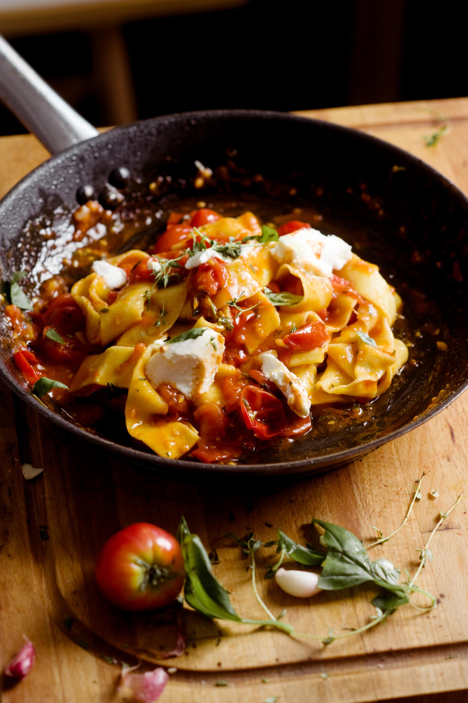 Rajčice prepolovite, češnjak prignječite nožem (ostavite ga u tom obliku). Na vrućem ekstra djevičanskom maslinovom ulju stavite pržiti cherry rajčice, povremeno ih preokrenite. Kada se rajčica zaprži i pusti sok, dodati češnjak i kratko ga zapržiti, posolite i popaprite i dodajte majčinu dušicu. Na laganoj vatri pirjajte još pet-šest minuta. Malo poškropite maslinovim uljem i stavite na tjesteninu uz komadiće ricotte.