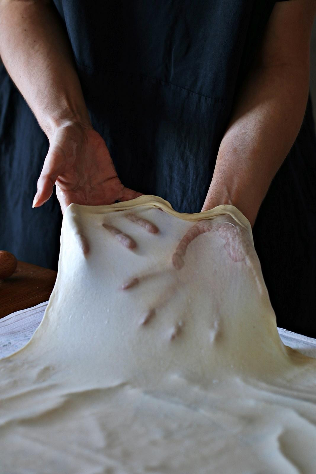 Stol na kojem ćete razvlačiti tijesto prekrijte čistim stolnjakom koji lagano pobrašnite. Odmoreno tijesto položite na stolnjak posipan oštrim brašnom, lagano pobrašnite i samo tijesto i razvaljajte valjkom za tijesto na debljinu od pola centimetra. Površinu tijesta nauljite, ostavite da tako odstoji jedno 10 minuta, potom ga pažljivo razvucite rukama, ali ne pretanko, da može nositi teški nadjev od šljiva.