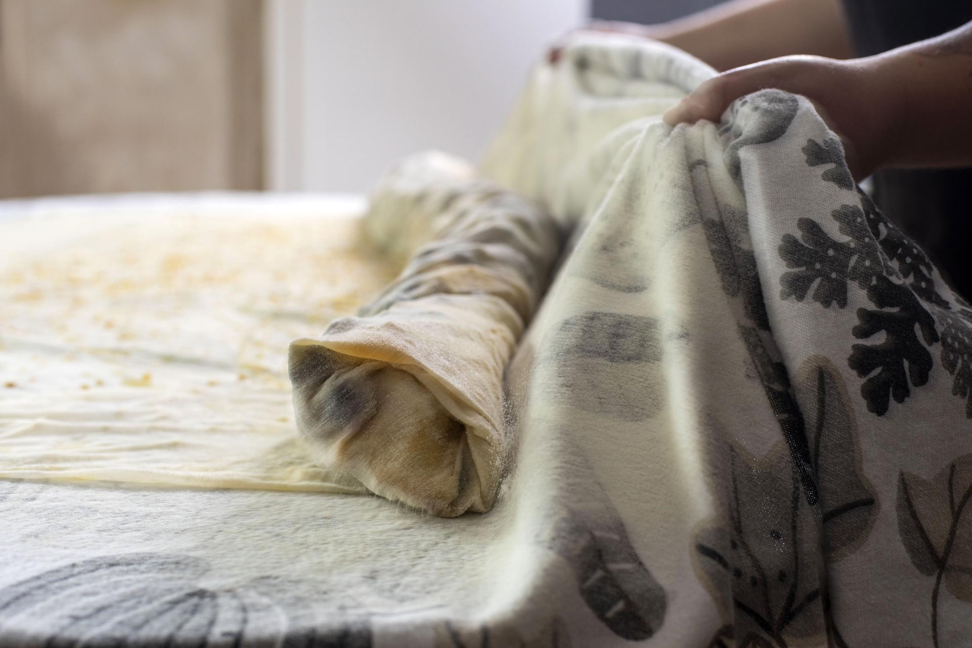 Pripremite manju posudu koju možete dobro poklopiti da ne ulazi zrak. Ulijte malo ulja u posudu i razmažite ga po stijenkama. Pomiješajte vodu i sol pa ih ulijte u brašno. Dodajte ulje i umijesite glatko tijesto. Oblikujte kuglu. Pouljite tijesto, stavite ga u pripremljenu posudu i poklopite. Pustite da odmara barem pola sata na sobnoj temperaturi. Pripremite stolnjak na kojem ćete razvlačiti tijesto. Pobrašnite stolnjak oštrim brašnom. Pećnicu stavite zagrijavati na 200 °C. Na sredinu stola stavite tijesto, pobrašnite ga i prvo razvaljajte u svim smjerovima. Pustite tijesto desetak minuta da odmori. Razvucite tijesto u svim smjerovima da bude ravnomjerno tanko. Uz rub stola pospite krušne mrvice pa rasporedite kupine i jabuke. Polijte ih medom i pospite cimetom. Po ostatku tijesta poškropite otopljeni maslac i pospite bademe ili lješnjake. Škarama odrežite debele rubove tijesta pa s pomoću stolnjaka savijte savijaču. Savijaču premjestite u protvan namazan uljem. Namažite otopljenim maslacem pa stavite peći u pećnicu zagrijanu na 200 °C oko 15 minuta ili do zlatno-žute boje.