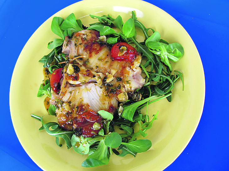 Na svaki tanjur stavite rokulu i matovilac, preko njih odreske morskog psa