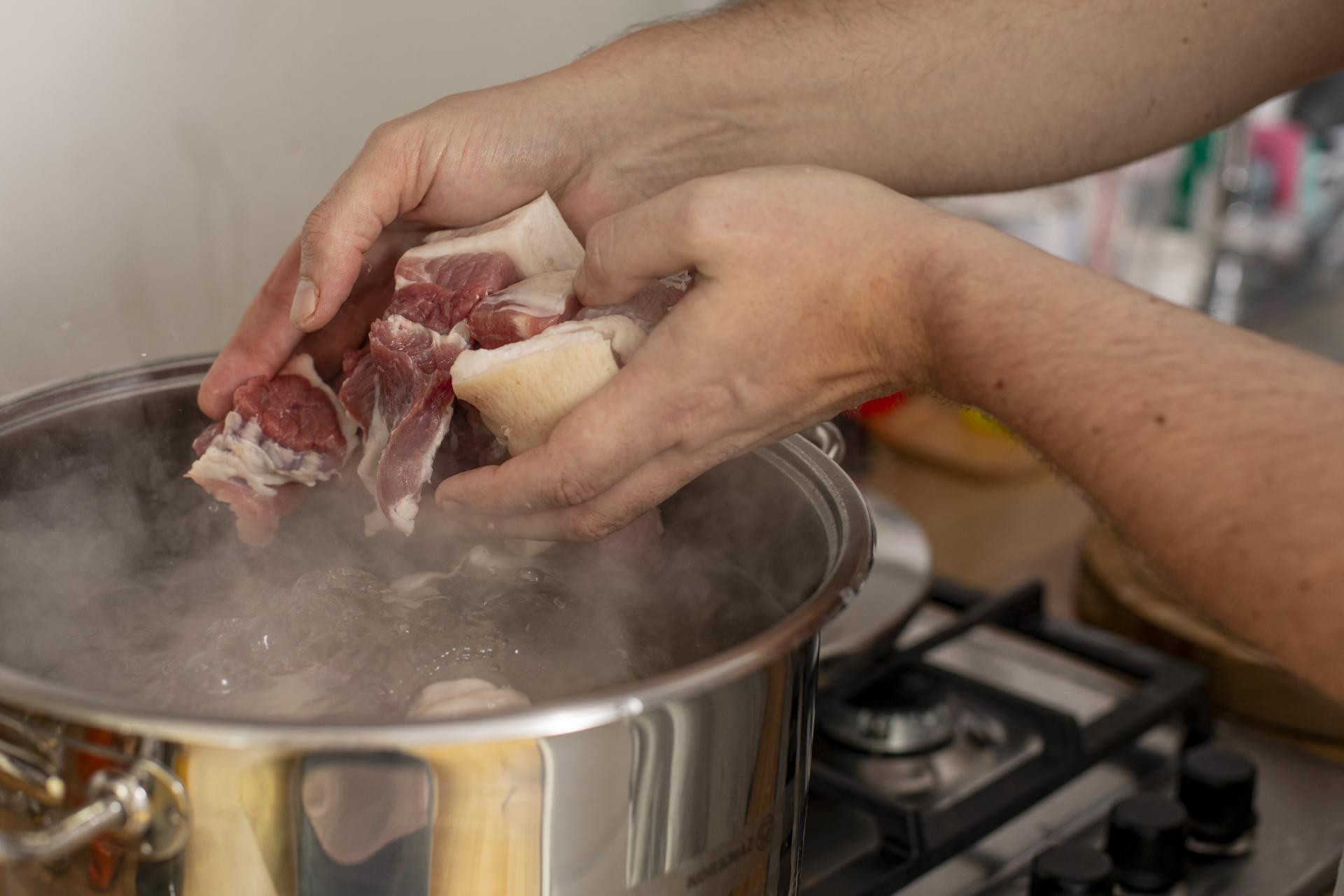 Kocke mesa stavite kuhati u vodu začinjenu rižinim vinom i komadima đumbira i češnjaka.