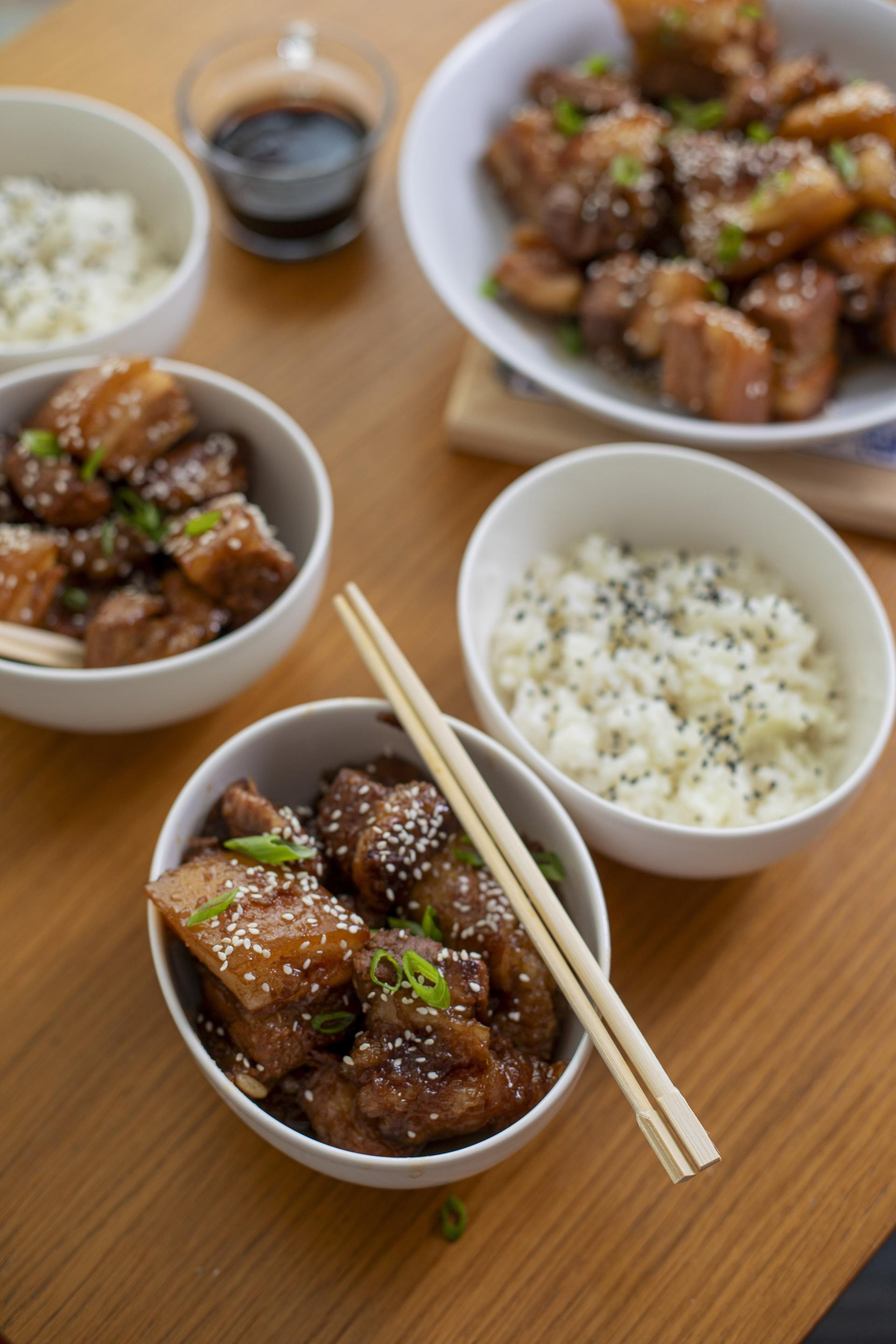U tradicionalnoj kineskoj medicini i simbolici, svinjetina (posebno masna) navodno donosi obilje, snagu i sreću. Potrbušina, kao najizdašniji dio, često se servira na svadbama i rođendanima, zato me začudio način pripreme drugog recepta inspiriranog klasičnim kineskim receptom Dong Po Rou, koji zahtijeva da se kockice carskog mesa (5x5 cm) dugo kuhaju u začinjenoj vodi, a zatim završe u sosu.