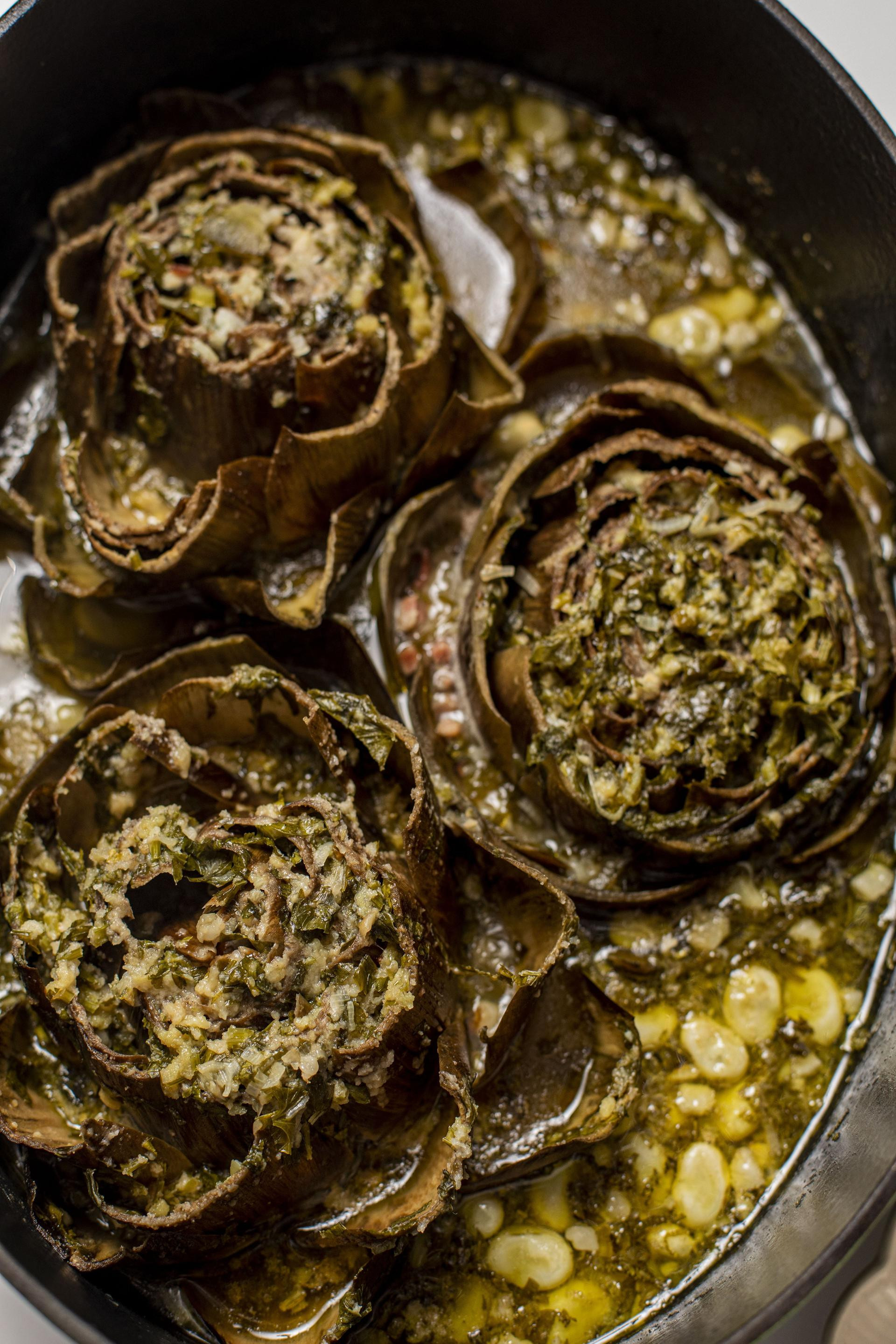 Peršin i češnjak usitnite te sve pomiješajte s krušnim mrvicama. Toj smjesi dodajte naribani parmezan i sve lagano promiješajte. Stavite sa strane. Ljutiku usitnite, a pancetu narežite na prutiće. U veću zdjelu ulijte hladnu vodu te u nju dodajte sok jednog limuna. Artičoke očistite tako da im odstranite peteljku ako je imaju i zatim maknite vanjske tvrde latice - listove. Prerežite nožem do sredine cvijeta artičoke kako biste odstranili tvrde vrhove. Probajte malo razdvojiti listove te plod uronite u zdjelu s limunom da ne potamni. Ponovite postupak sa svim artičokama. U veću posudu, u kojoj ćete kuhati jelo, stavite maslinovo ulje i dodajte ljutiku. Lagano popržite, a zatim dodajte pancetu. Dok se lagano prži, napunite artičoke mješavinom krušnih mrvica i peršina, i to na sljedeći način: artičoku ocijedite od vode te prstima između latica obilno ugurajte spomenutu mješavinu. Artičoke stavite u posudu. Koju minutu pecite ih na ljutiki i panceti te zatim dodajte bob, temeljac (bitno je da artičoke do vrha budu u tekućini), sol i papar po želji te maslinovo ulje. Svaku artičoku zalijte s malo maslinova ulja. Jelo kuhajte oko 50 minuta na laganoj vatri. Važno je da su artičoke u umaku, nikako ne smiju biti na suhom jer se neće dobro skuhati, odnosno - omekšati. Jelo se može servirati toplo, a dobro je i podgrijano drugi dan.
