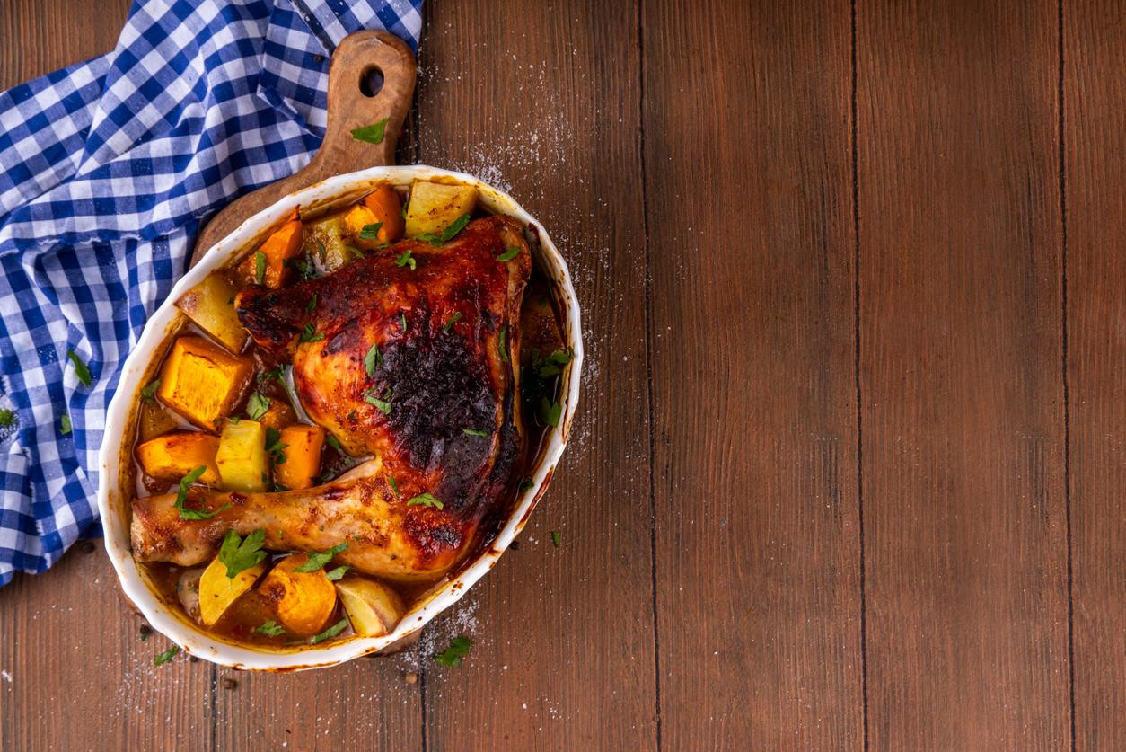 Pečeni batak i zabatak poslužen s varivom od buče i krumpira spaja sočnost mesa s blagim, kremastim povrćem, stvarajući topao, zasitan obrok koji miriše na domaću kuhinju.