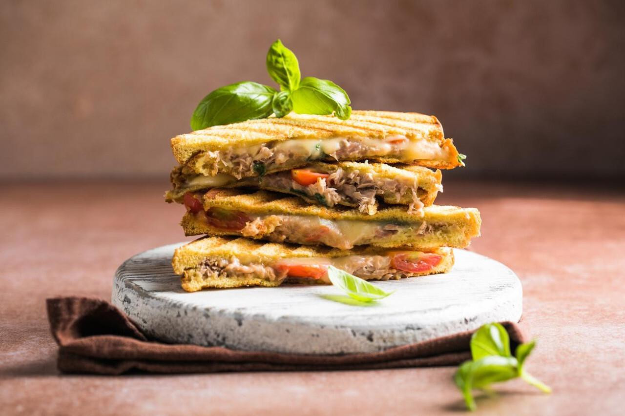 Premažite kriške kruha s malo maslaca s vanjske strane. U zdjeli pomiješajte ocijeđenu tunu s majonezom ili kremastim sirom, posolite i popaprite po ukusu. Na nepremazanu stranu kruha stavite sloj tune, zatim kolutove rajčice i narezani sir. Poklopite drugom kriškom kruha, maslom okrenutom prema van. Tostirajte sendviče u tosteru ili na tavi na srednje jakoj vatri 3-5 minuta sa svake strane, dok kruh ne postane zlatno-smeđ i hrskav, a sir se ne rastopi.