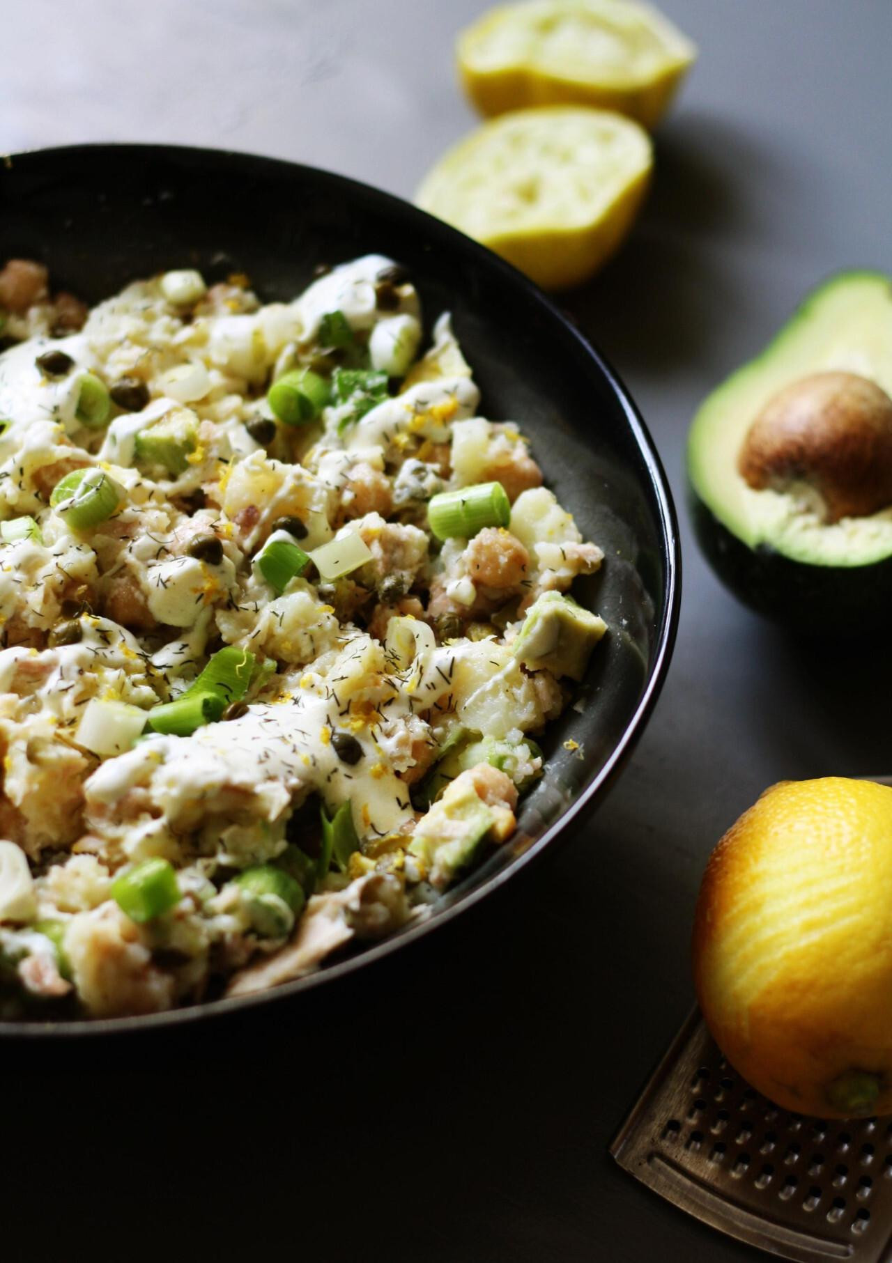 Krumpir najprije skuhajte u ljusci, očistite pa ga prstima usitnite i ubacite u zdjelu. Dodajte tunu, sjeckani mladi luk i slanutak. Promiješajte. Dodajte i avokado te kapare. Prema želji, dodati možete i malo inćuna koje ste nožem pretvorili u pastu. Dodajte sol i papar i dobro promiješajte. U zdjelu ubacite i sitno sjeckane kisele krastavce. U grčki umak dodajte malo maslinova ulja, začinsko bilje prema želji, limunov sok, senf, sol i papar. Dobro promiješajte i dodajte u salatu. Sve zajedno dobro povežite, ohladite i poslužite. Po vrhu možete naribati i malo limunove korice.