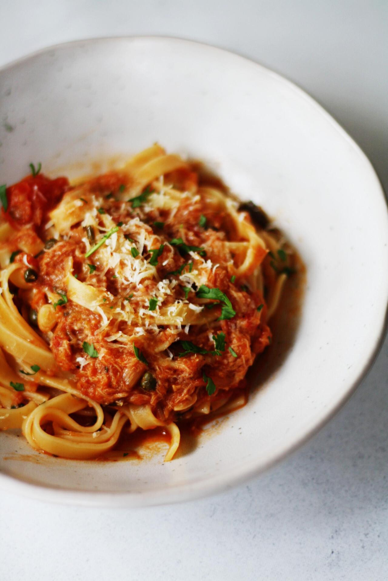 U lonac dodajte vodu, posolite je i pustite da zavrije. Za to vrijeme nasjeckajte luk i pirjajte ga na vrućem ulju dok ne postane staklast. Dodajte protisnuti češnjak, šećer, sol i papar, dodajte naribanu mrkvu, kapare i inćune koje ste nasjeckali na sitno. Kratko pirjajte pa potom dodajte i pelate. Pustite da se kuha 10-ak minuta. Dodajte potom tunu, začinite po želji i kada je tjestenina pri kraju, zajedno s malo vode u kojoj se kuhala, prebacite je u umak. Na kraju pospite sa svježim bosiljkom i drugim svježim začinskim biljem po želji.