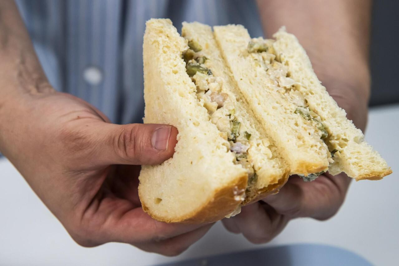 Slanutak zgnječite vilicom ili alatom za izradu pire krumpira. Dodajte ostatak sastojaka i sve dobro promiješajte. Ne zaboravite začiniti limunovim sokom, soli i paprom. Kruh narežite na kriške, po jednoj rasporedite dobivenu smjesu, preklopite, prepolovite i poslužite.