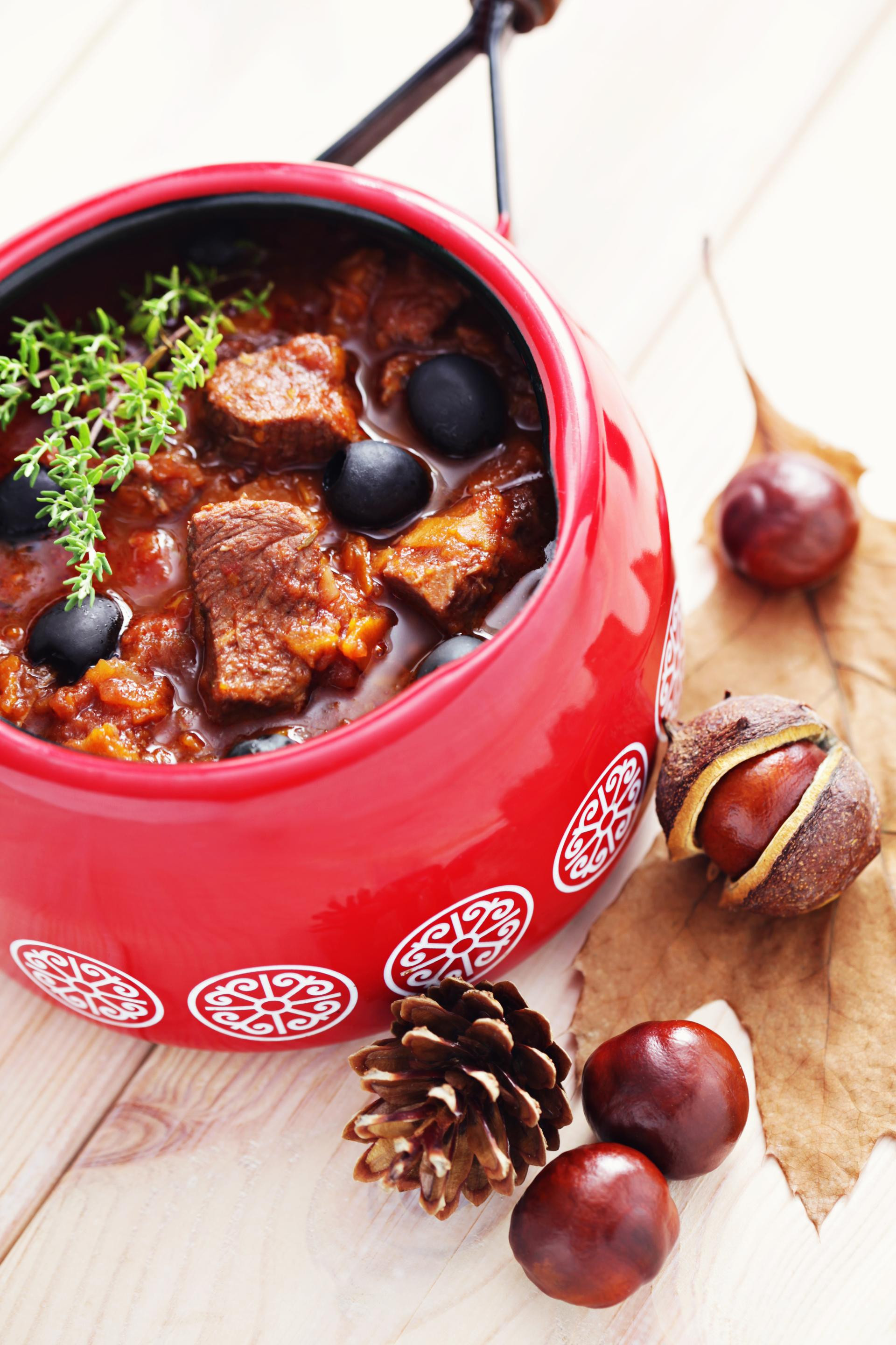 U dubljoj posudi zagrijte ulje ili mast i dodajte meso. Pirjajte dok ne dobije lijepu smeđu boju sa svih strana. Izvadite ga na tanjur i odložite sa strane. U istoj posudi dodajte nasjeckani luk i pirjajte dok ne omekša i postane zlatan. Zatim dodajte sitno nasjeckani češnjak, narezanu mrkvu i papriku, pa kratko propirjajte. Umiješajte dimljenu papriku, koncentrat rajčice i kratko popržite da se razviju okusi. Vratite meso u lonac, podlijte crnim vinom i pustite da alkohol ispari. Zatim dodajte temeljac, začinite solju, paprom i timijanom, poklopite i kuhajte na laganoj vatri oko 1,5 sat, dok meso ne omekša. Pred kraj kuhanja (zadnjih 15–20 minuta) dodajte kestene i crne masline. Nježno promiješajte i pustite da se sve poveže u gust, aromatičan umak. Gulaš poslužite topao, uz pire krumpir ili domaći kruh.