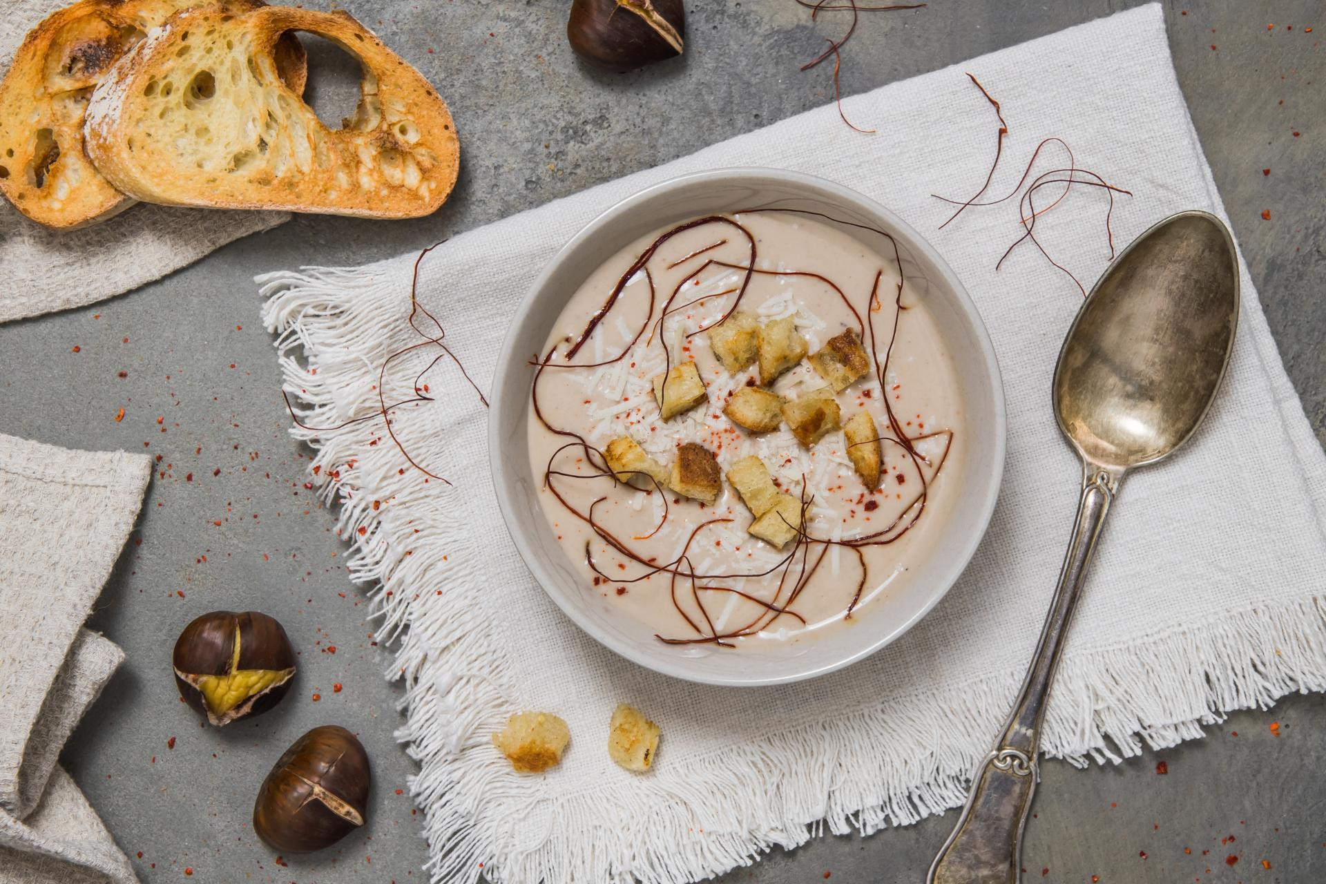 Krem juha od kestena s parmezanom, krutonima i čilijem