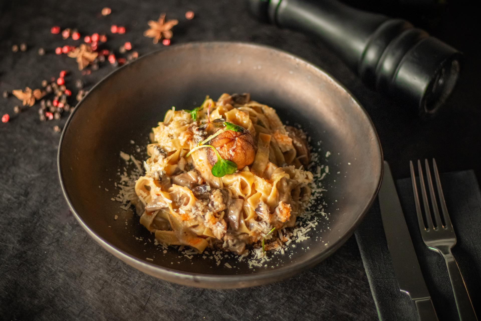 Skuhajte tjesteninu u slanoj vodi prema uputama na pakiranju. Ocijedite i sačuvajte malo vode od kuhanja (oko ½ šalice). U širokoj tavi zagrijte maslinovo ulje ili maslac. Dodajte sitno nasjeckani luk i pržite dok ne postane staklast. Dodajte nasjeckani češnjak i gljive pa pirjajte dok gljive ne puste tekućinu i lagano se zapeku. Umiješajte grubo nasjeckane kestene i kratko ih propirjajte da puste aromu. Po želji podlijte bijelim vinom i pustite da alkohol ispari. Ulijte vrhnje za kuhanje i pustite da se umak zgusne nekoliko minuta. Za kremastiju teksturu dodajte žlicu ili dvije vode od tjestenine. Umiješajte skuhanu tjesteninu u umak i dobro promiješajte da se sve poveže. Posolite i popaprite po ukusu. Poslužite odmah, pospite svježim listićima rikole ili peršina i obilno naribanim parmezanom. Za dodatnu aromu, nekoliko kestena lagano prepecite na tavi i pospite po vrhu prije posluživanja, dat će jelu divnu hrskavost i orašasti miris.