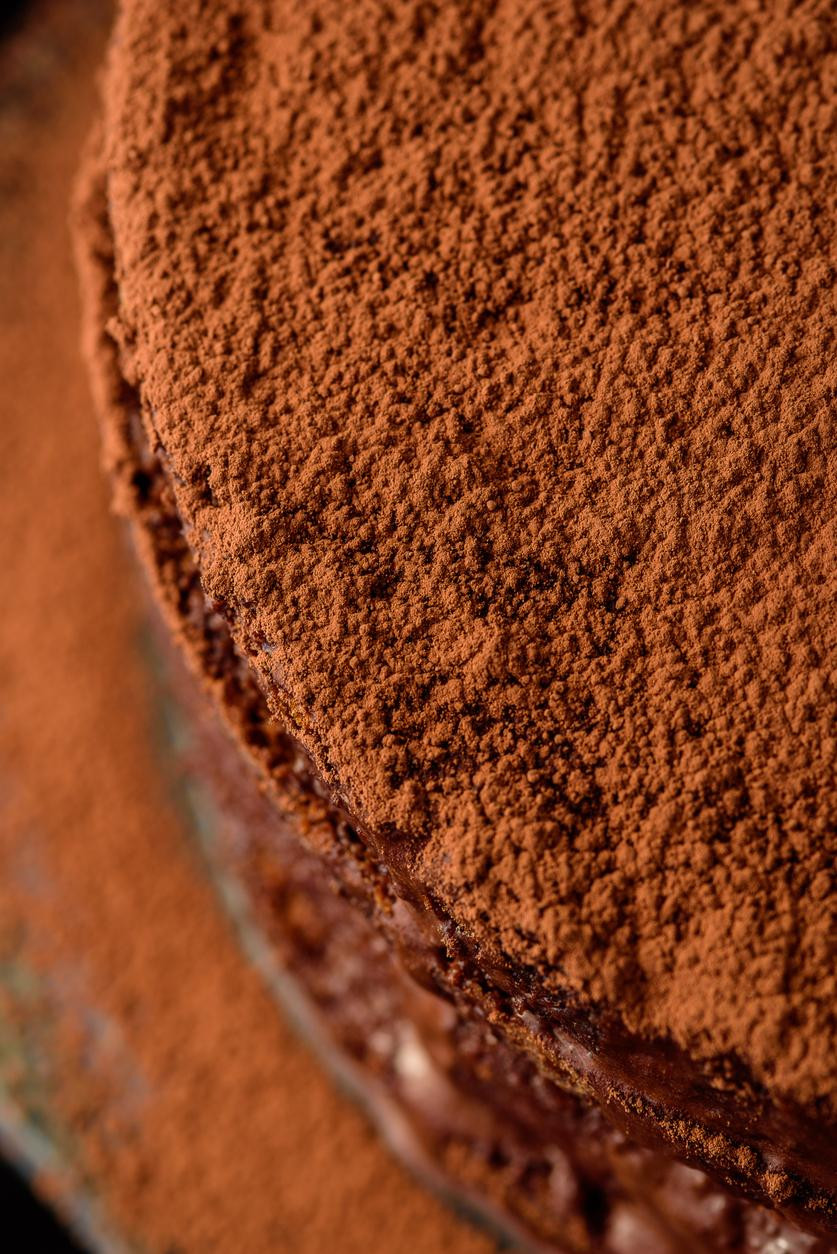 Prije posluživanja tortu izvadite iz hladnjaka i ostavite 20 minuta na sobnoj temperaturi. U sitnoj cjediljki prosijte kakao prah po vrhu torte. Nožem odvojite rubove torte od kalupa. Pomoću rubova papira pažljivo izvucite tortu iz kalupa i prenesite je na tanjur za posluživanje. Režite dugačkim, tankim nožem koji ste prethodno umočili u vruću vodu i obrisali prije svakog reza, tako će rezovi biti čisti i uredni.