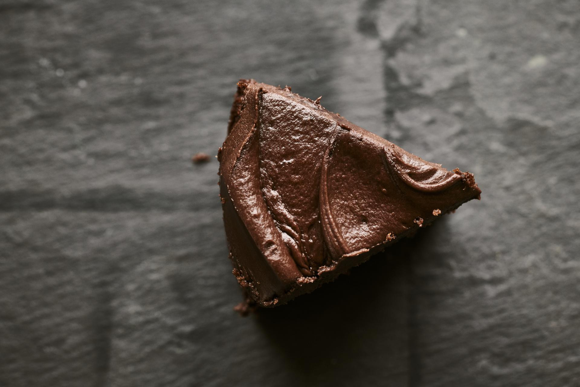 U velikoj vatrostalnoj zdjeli iznad posude s lagano kipućom vodom (metoda pare) otopite maslac. Kad se otopi, dodajte nasjeckanu čokoladu i miješajte dok smjesa ne postane glatka i sjajna. Maknite s pare, pa umiješajte šećer. Zatim jedno po jedno dodajte hladna jaja, svaki put snažno miješajući pjenjačom barem 1 minutu nakon zadnjeg jajeta. Smjesa će postati gusta i sjajna, poput pudinga. Dodajte suhe sastojke i lagano, ali temeljito promiješajte dok se sve ne sjedini. Smjesu izlijte u pripremljeni kalup i lagano udarite kalup o radnu površinu nekoliko puta da se tijesto slegne i uklone zračni mjehurići.