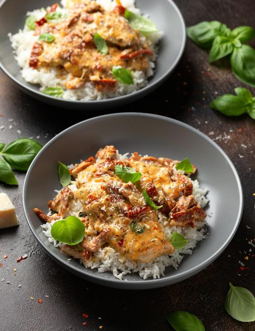 Kremasta, aromatična i puna okusa, piletina s rižom prava je utješna hrana koja će zadovoljiti cijelu obitelj. Nježni pileći filei najprije se lagano zapeku da dobiju zlatnu koricu, a zatim se krčkaju u bogatom umaku od vrhnja, sušenih rajčica, parmezana i začina. Umak je pun dubine zahvaljujući pilećem temeljcu, češnjaku i suhom origanu, dok se čili pahuljice mogu dodati za laganu pikantnu notu.