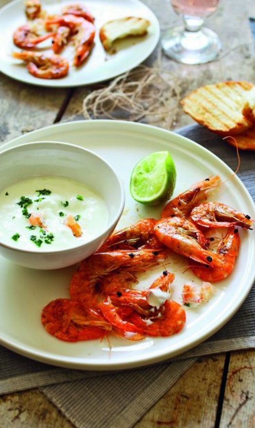 Za aioli pomiješajte jogurt, sitno sjeckani češnjak, sok i koricu limete, majonezu i peršin te ostavite u hladnjaku. Kozice očistite, osušite i uvaljajte u sol (kozice s oklopom). Kozice zapecite kratko na roštilju. Kozice servirajte uz aioli i prepečeni kruh.