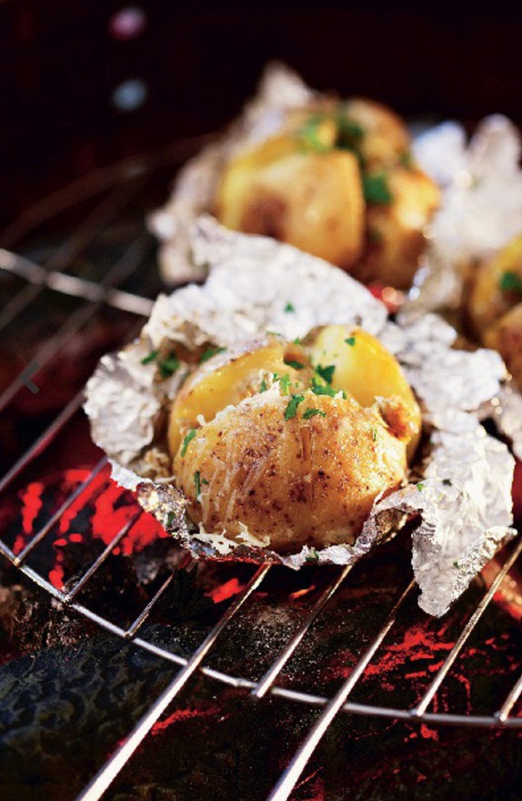 Krumpir skuhajte u kori (mora ostati malo tvrđi). Nasjeckajte začinsko bilje, tanko narežite luk. Foliju natrgajte na komade. Na sredinu svake folije stavite maslac, potom kolutiće luka, a zatim i krumpir. Odozgo ga križno razrežite, stavite kajmak pa pospite začinskim biljem. Dobro stegnite foliju. Pecite na rešetki roštilja otprilike dvadesetak minuta.