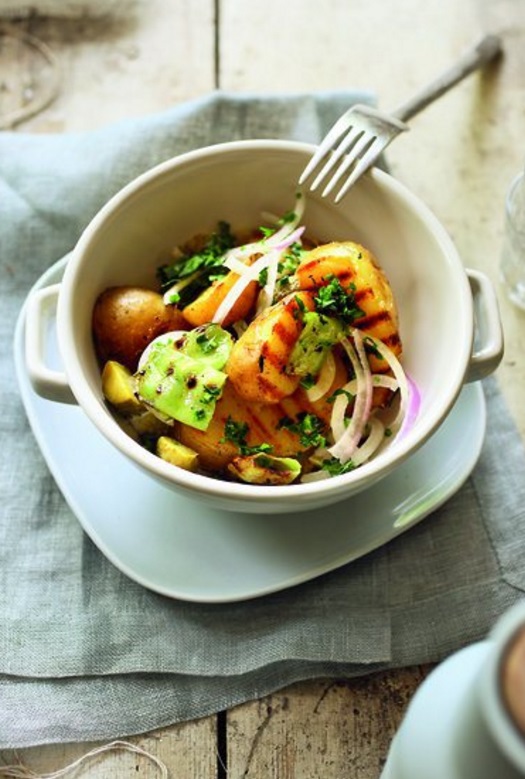 Krumpir operite te kuhajte na jakoj vatri dok ne omekša. Ocijedite ga i stavite po strani da se ohladi. Zatim ga narežite na deblje ploške, posolite, nauljite te pecite nekoliko minuta na roštilju. Luk narežite na kolutiće, pripremite krastavce, peršin i kopar. U zdjeli pomiješajte vrhnje, majonezu, senf, ocat, sitno sjeckane inćune i krastavce. Umiješajte krumpire i luk te dobro promiješajte da upiju dresing i na kraju dodajte kopar i peršin. Prema ukusu dodajte sol i papar.